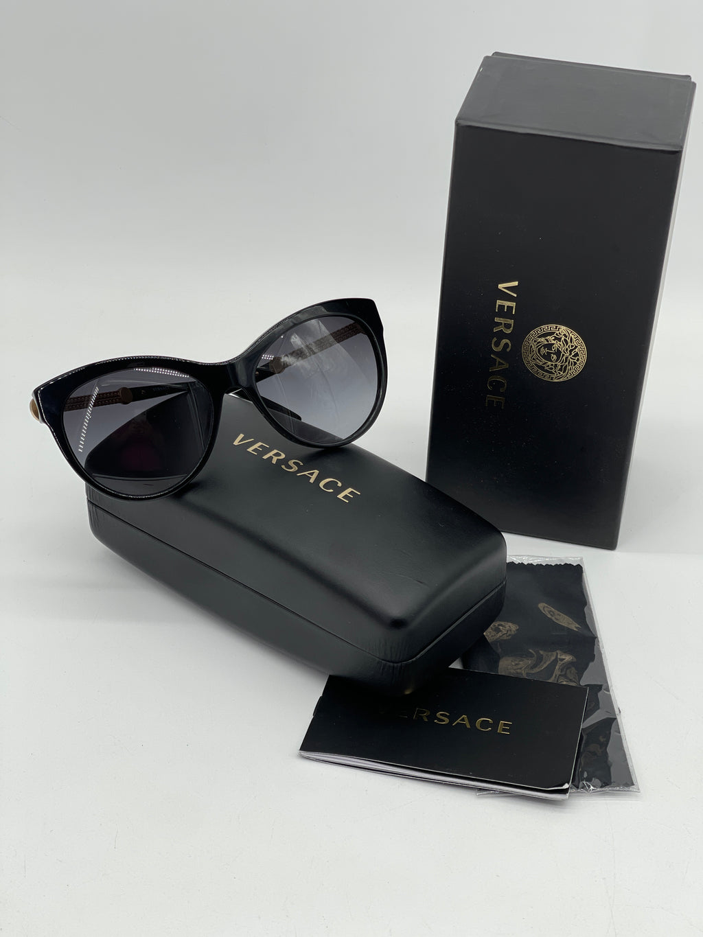 Pre Loved Versace Black Cat eye Chain Medusa Head Sunglasses with gold metal stems with Black Gradient lenses. BV00741214F 100724 P