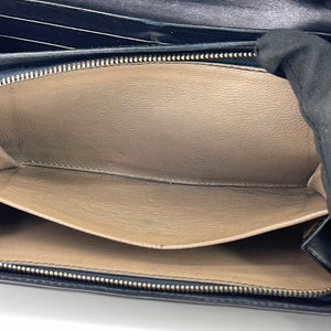 PRELOVED: GOOD Used Condition. Exterior leather has signs of wear in the front including 3 minor imperfections on the front. Signs of wear on the top corners of the wallet. Interior is in good condition. Snap closure has signs of heavy wear. Zipper works well. Includes duster.