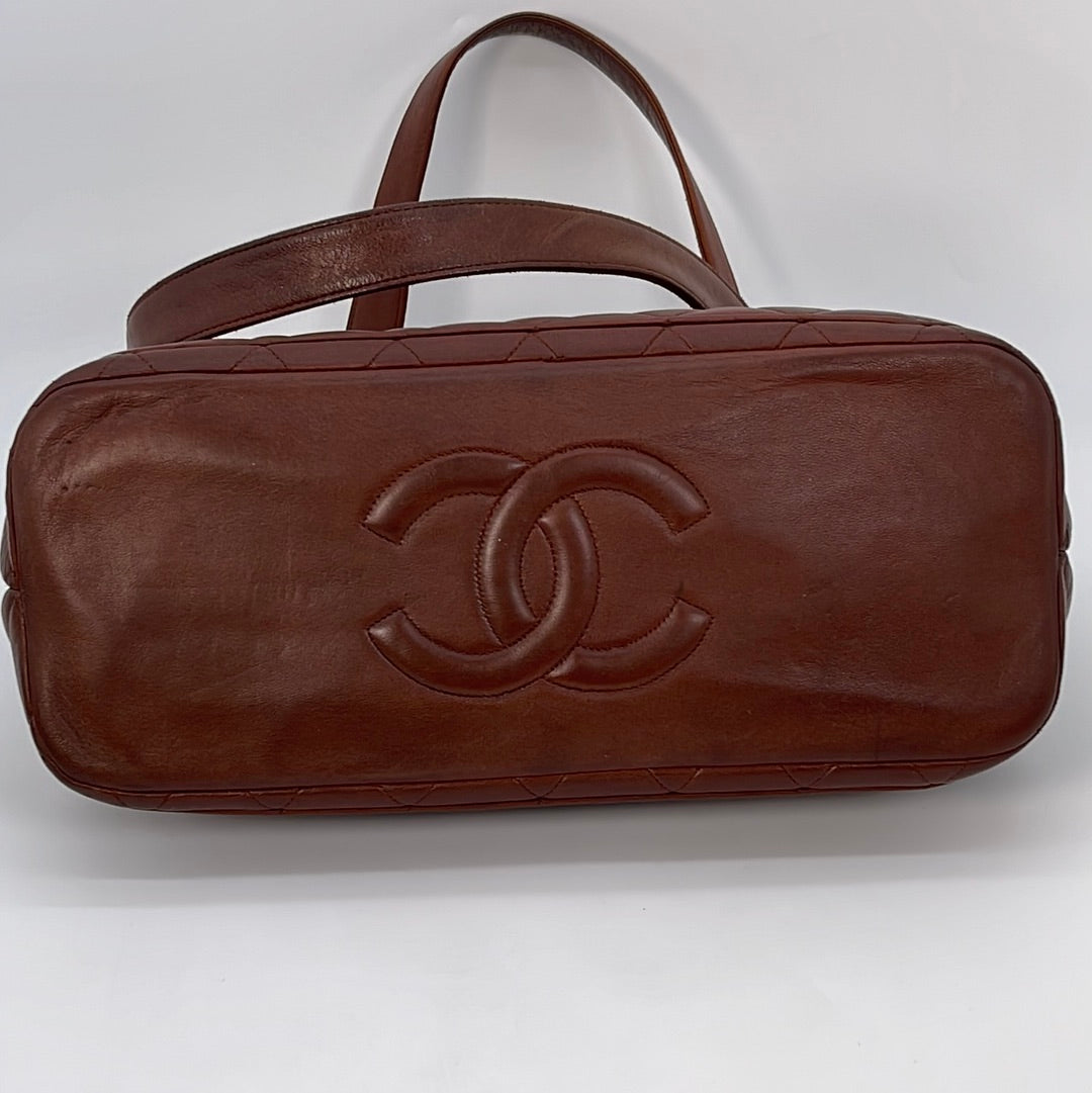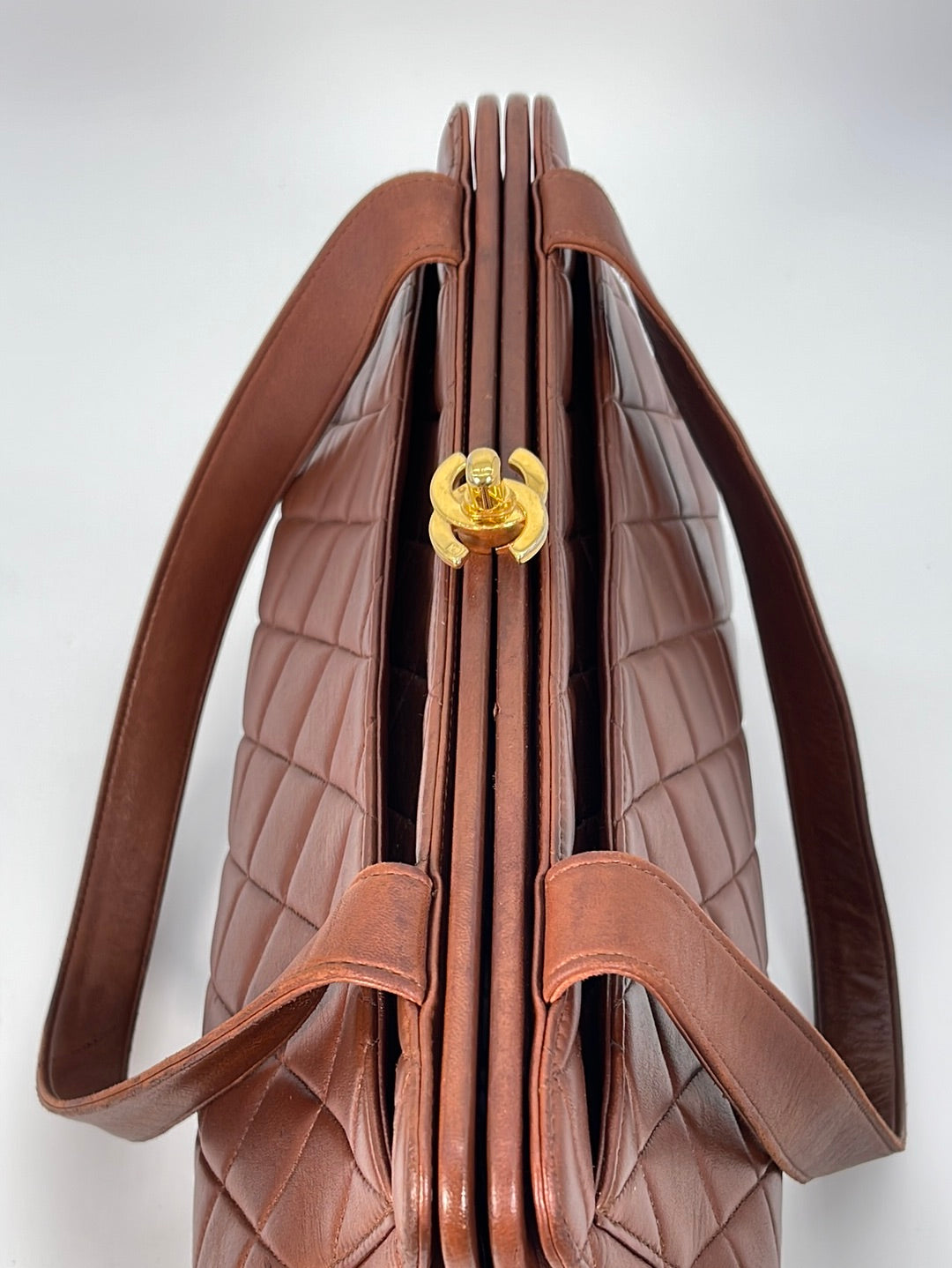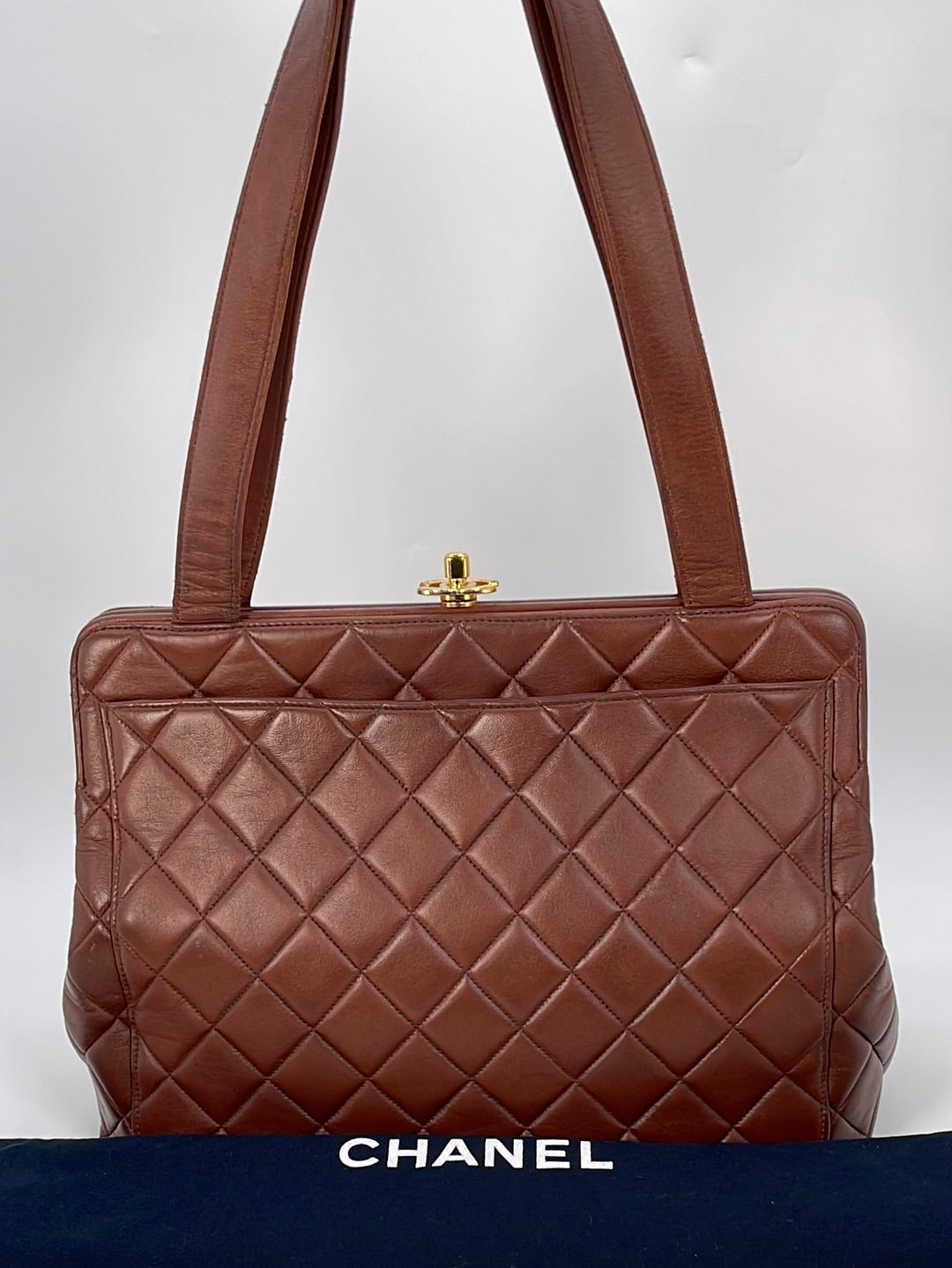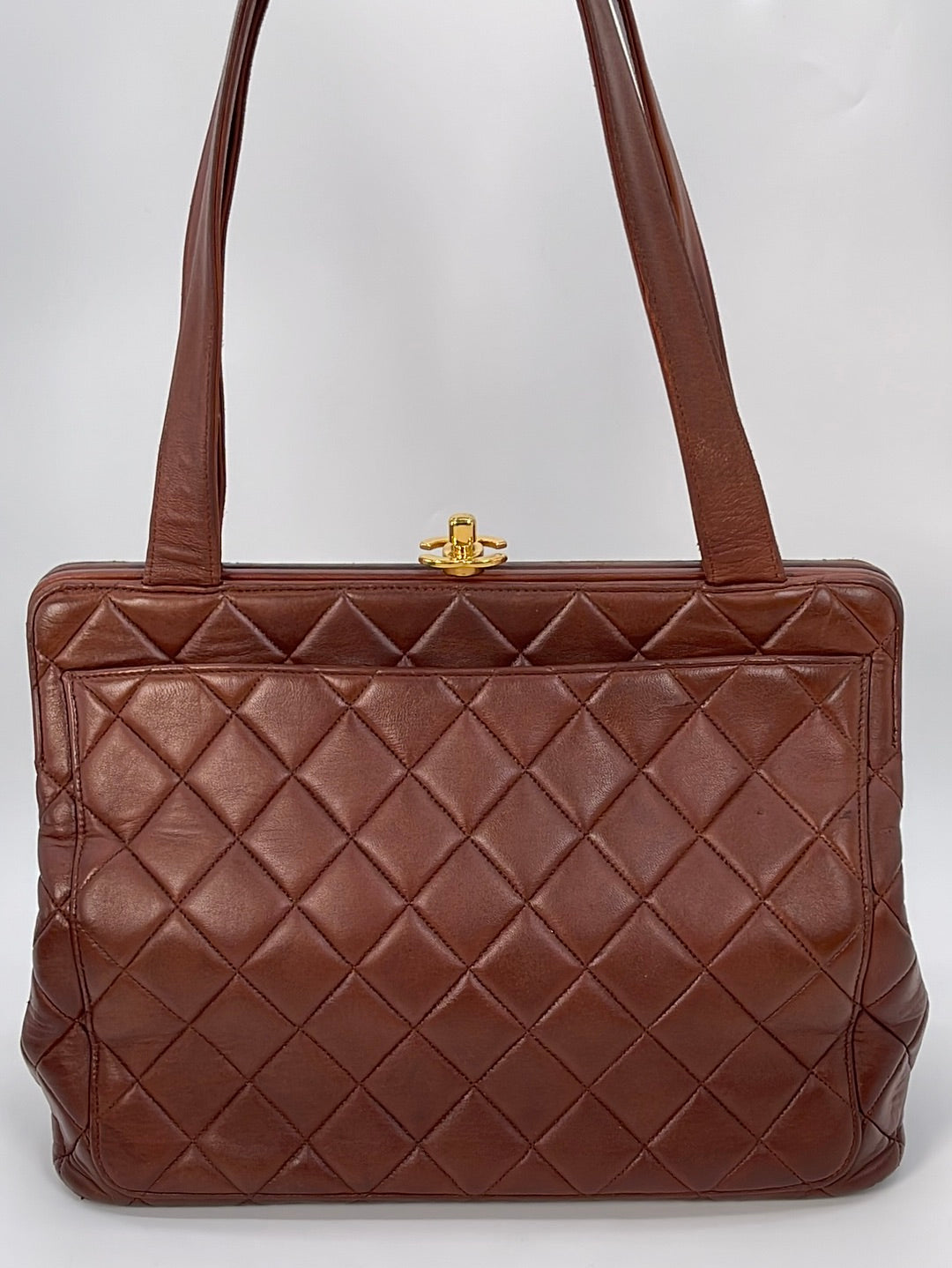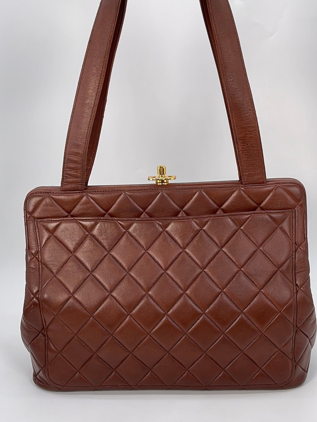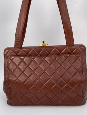 Preloved Chanel Brown Diamond Quilted Lambskin Leather CC Kiss Lock Tote. This bag features a gold tone CC Kiss Lock closure at top. One slip pocket and 1 zipper pocket with CC charm.