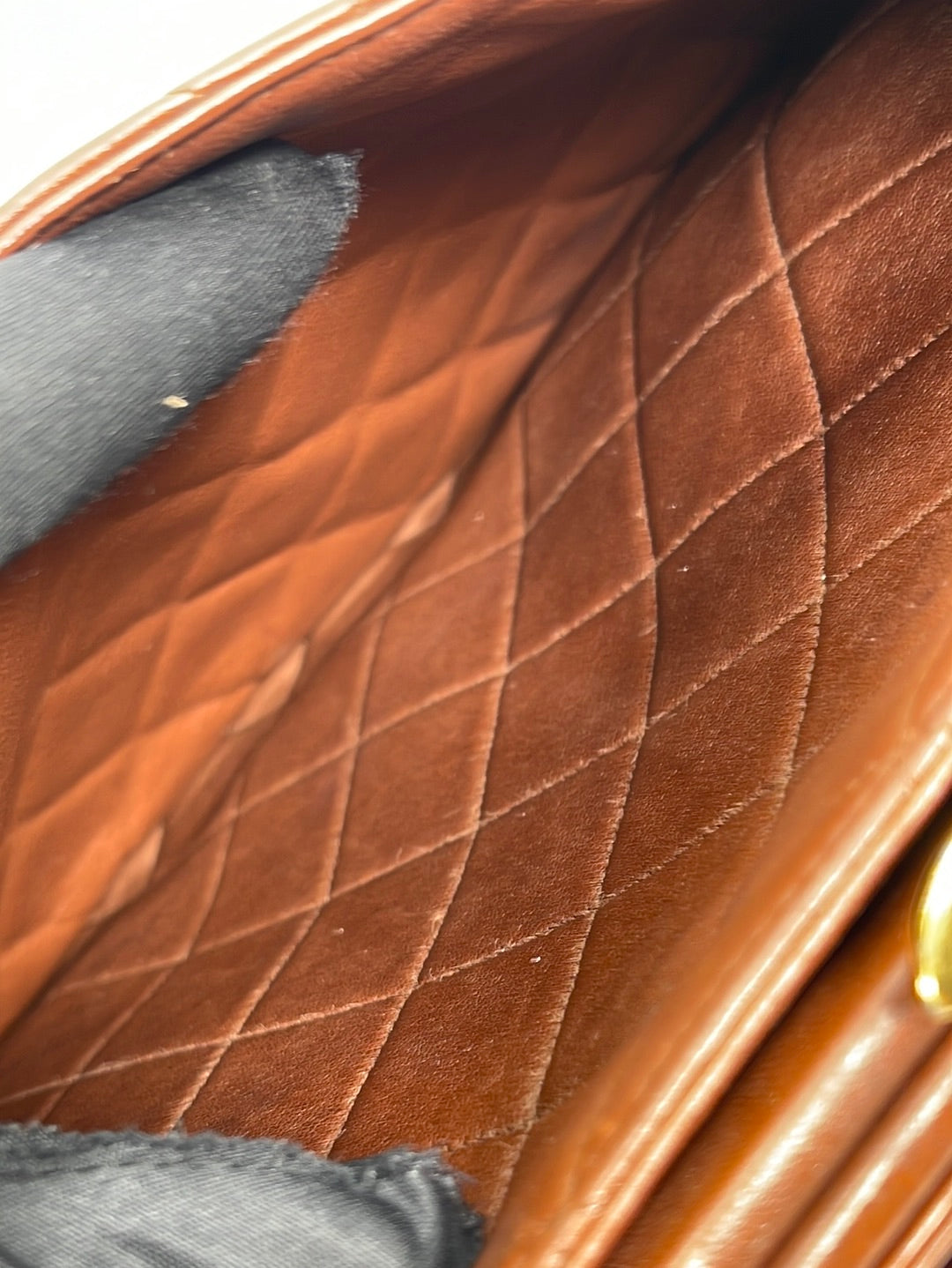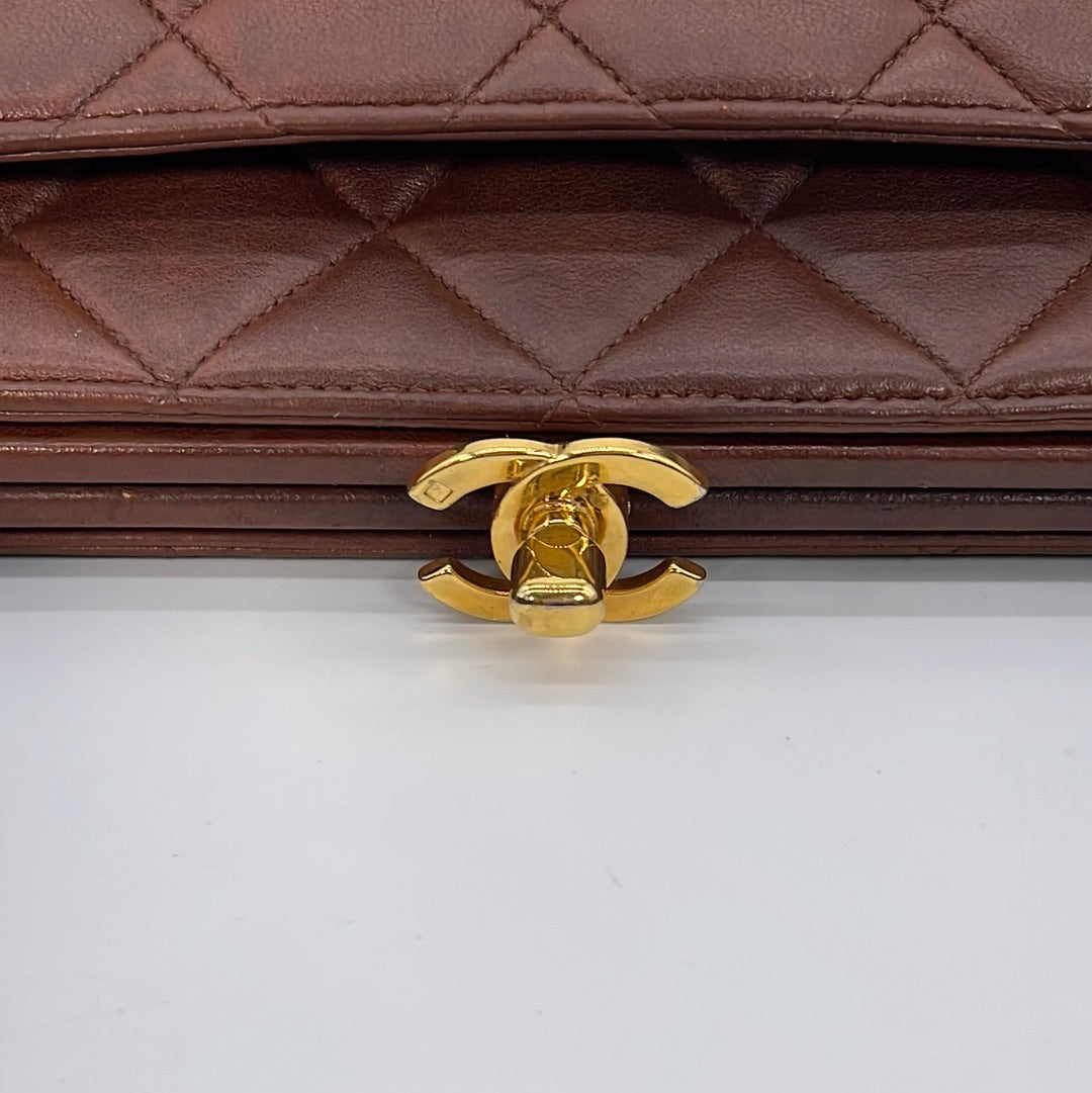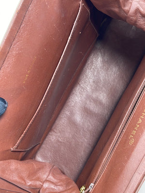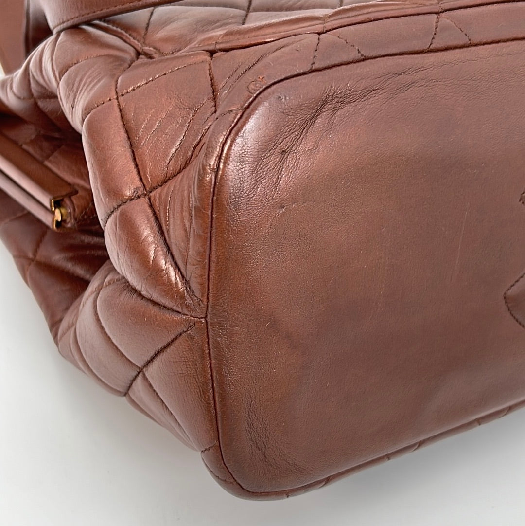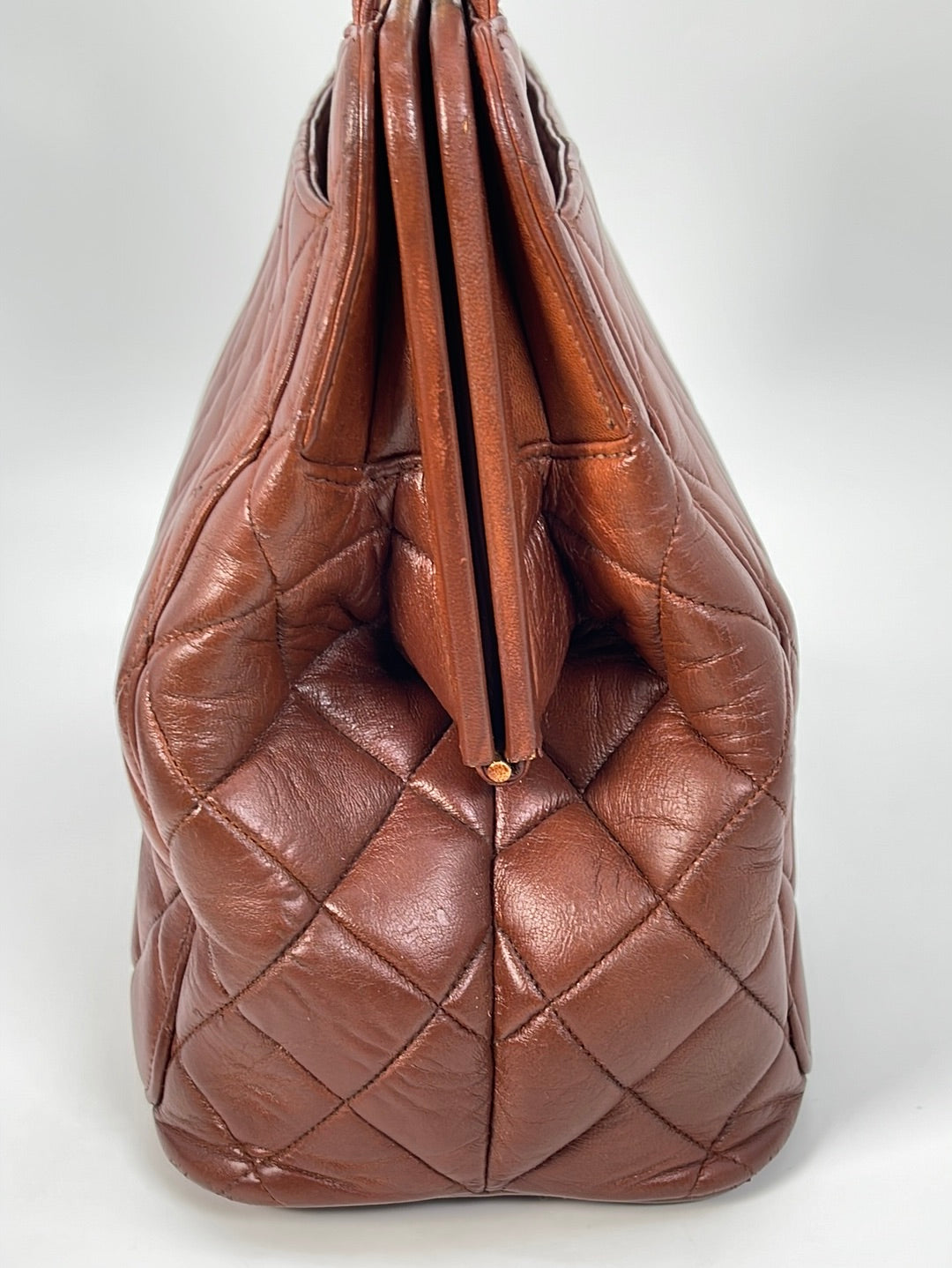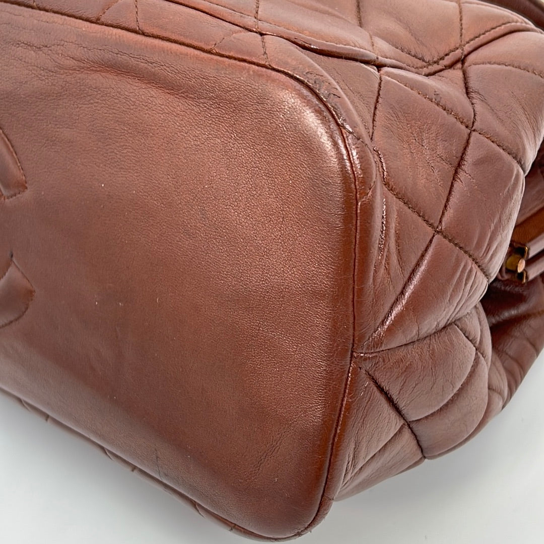 Preloved Chanel Brown Diamond Quilted Lambskin Leather CC Kiss Lock Tote. This bag features a gold tone CC Kiss Lock closure at top. One slip pocket and 1 zipper pocket with CC charm.