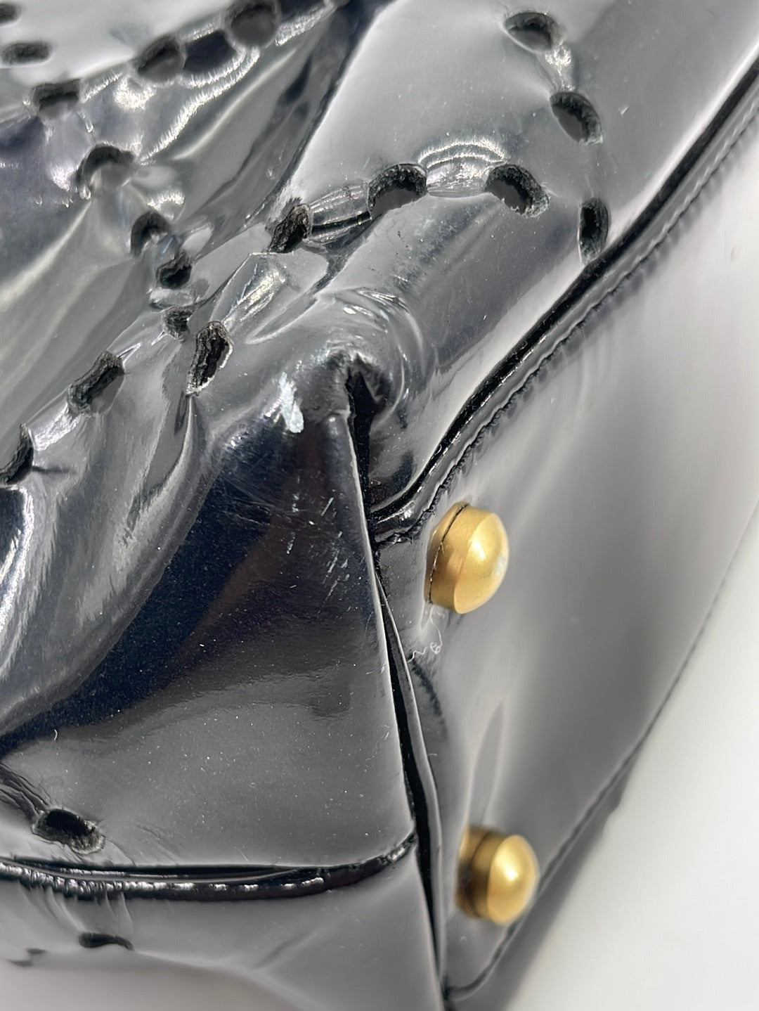 Preloved - Good used overall condition. Exterior has light scratch marks that the black patent leather hides well. Interior is lightly used but clean! The corners on the bottom of the bag has light wear. Handles/Straps are in great working condition. See photos for details.