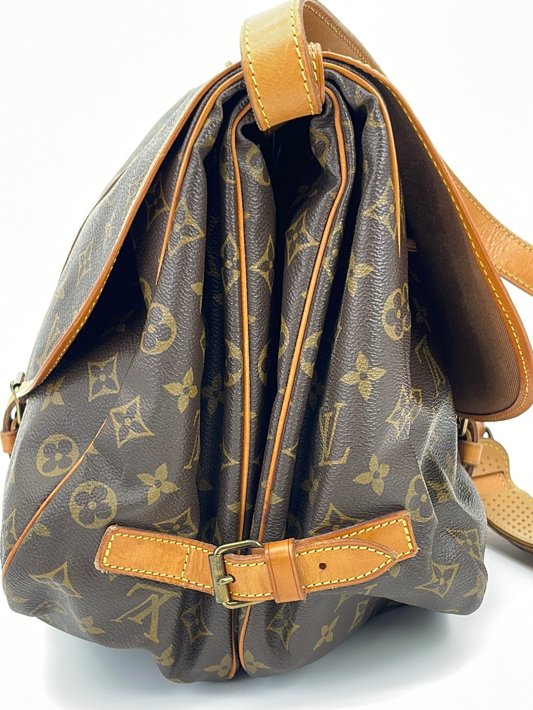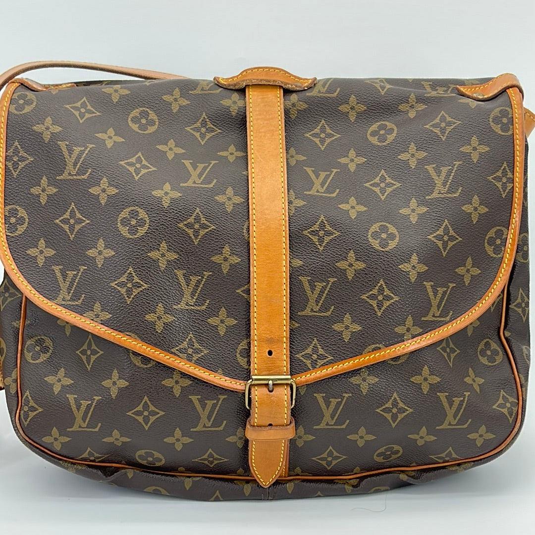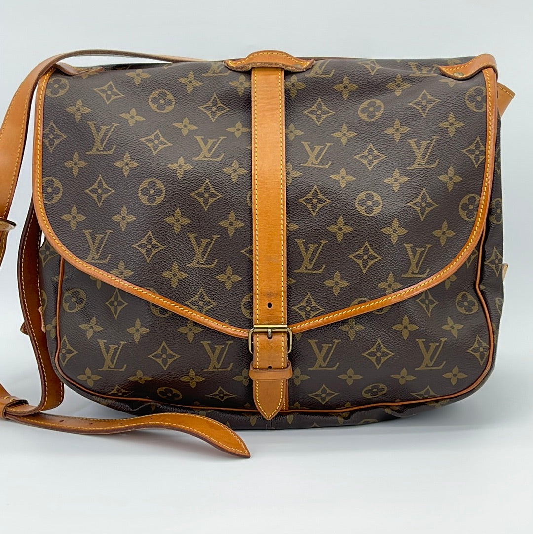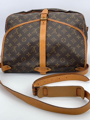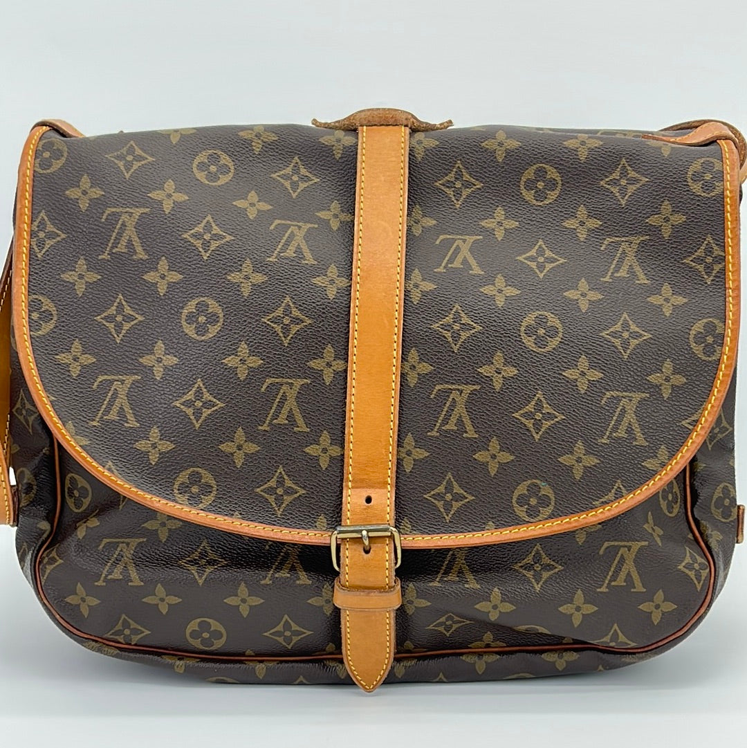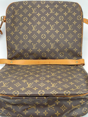 Authentic Vintage Louis Vuitton Monogram Canvas Saumur 35 Messenger Bag. Double compartment each with a buckle closure and adjustable long shoulder/ crossbody strap.