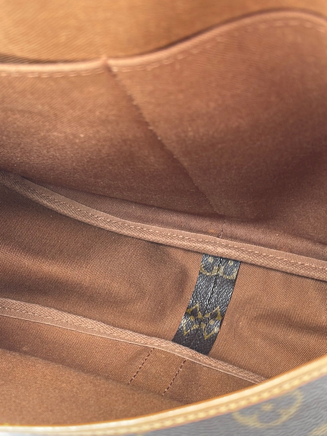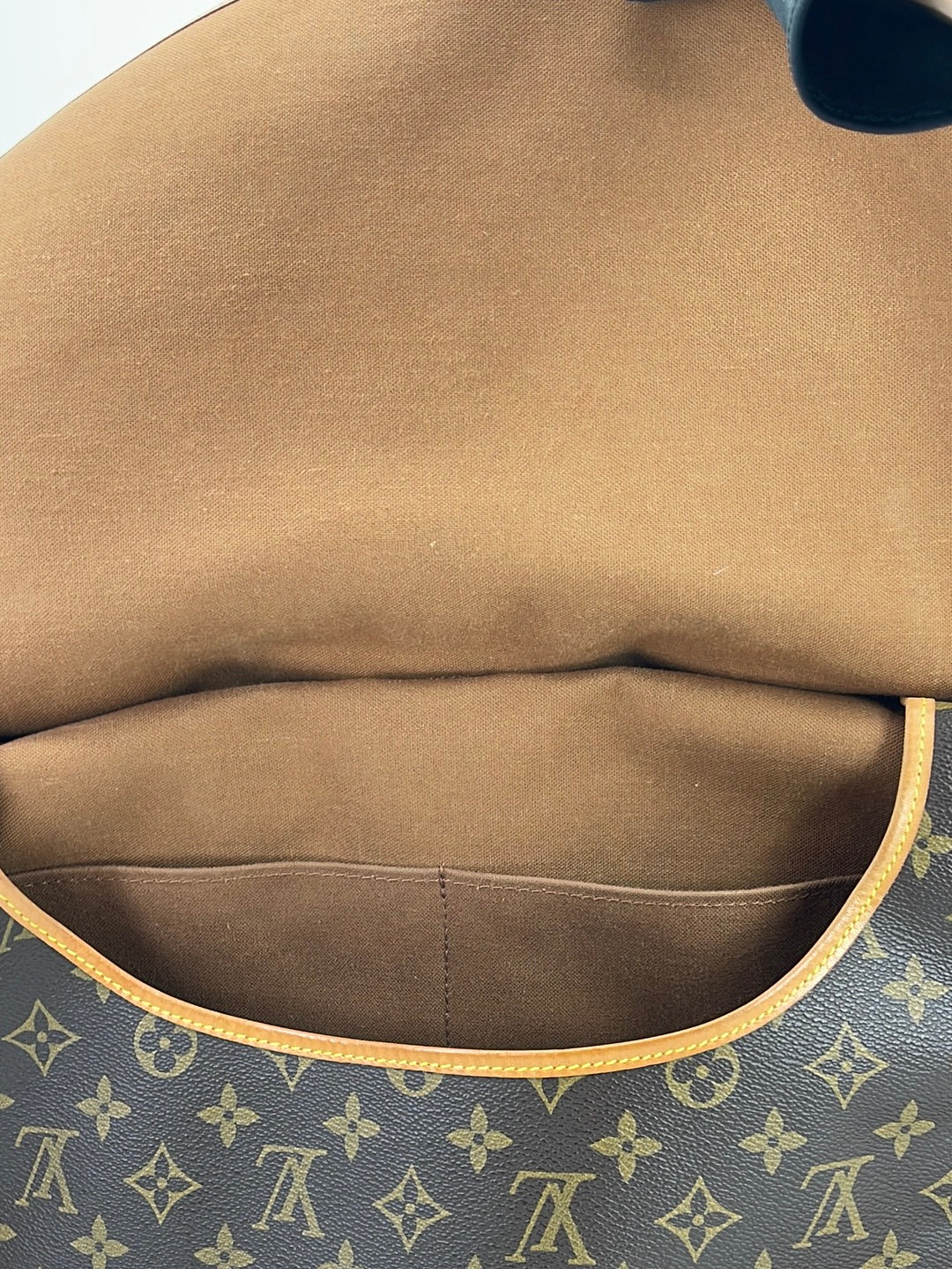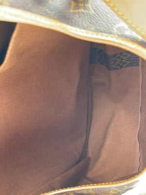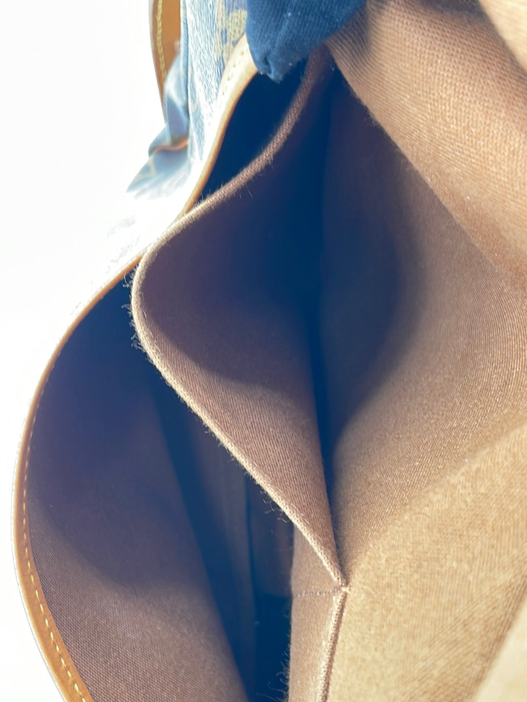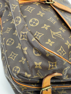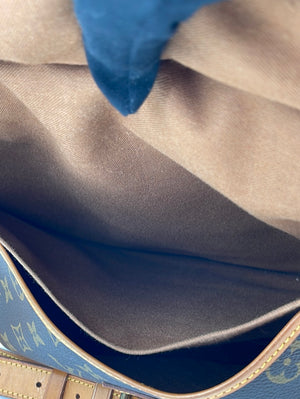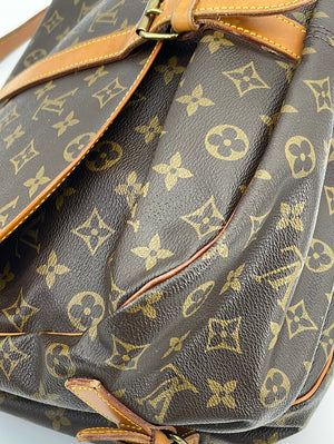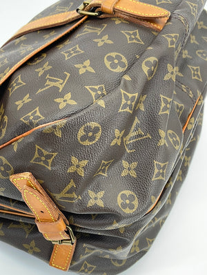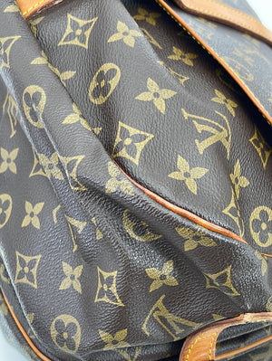 Authentic Vintage Louis Vuitton Monogram Canvas Saumur 35 Messenger Bag. Double compartment each with a buckle closure and adjustable long shoulder/ crossbody strap.