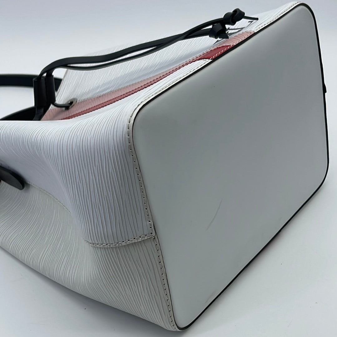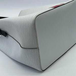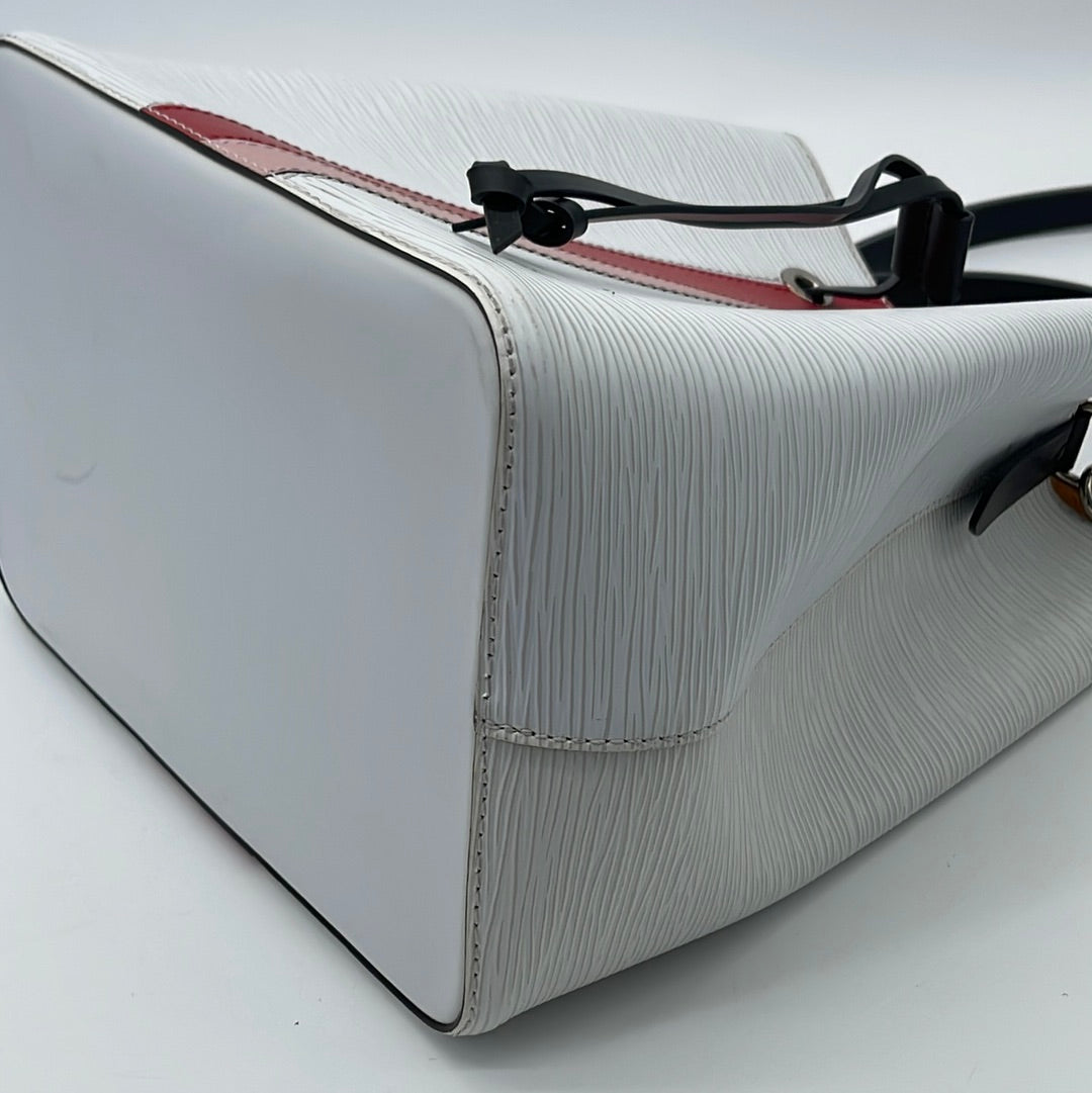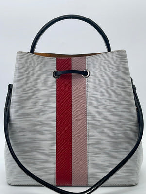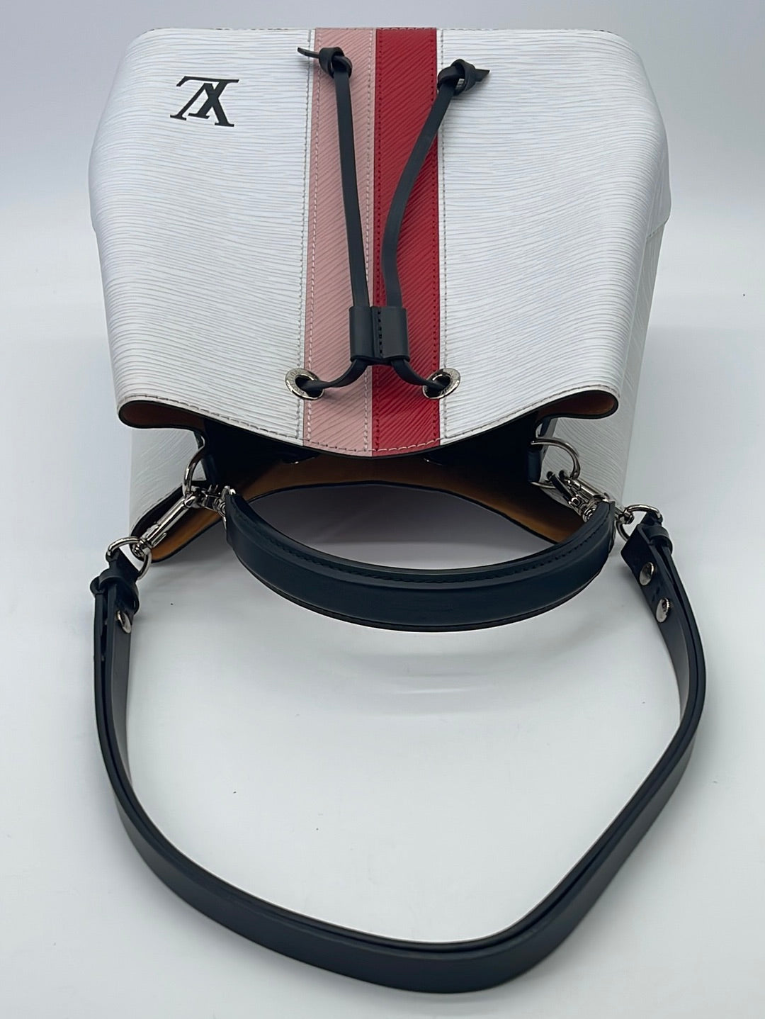 Preloved LOUIS VUITTON Limited Edition White, Red, and Pink Epi Stripes Neo Noe 2WAY Shoulder Bag The Neonoe features an epi leather body, a detachable flat leather strap, a drawstring closure, and an interior zip pocket.