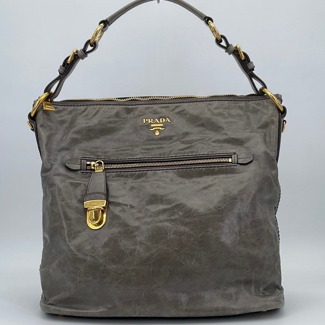 Preloved Prada Gray Vitello Shine Leather Large Hobo Bag