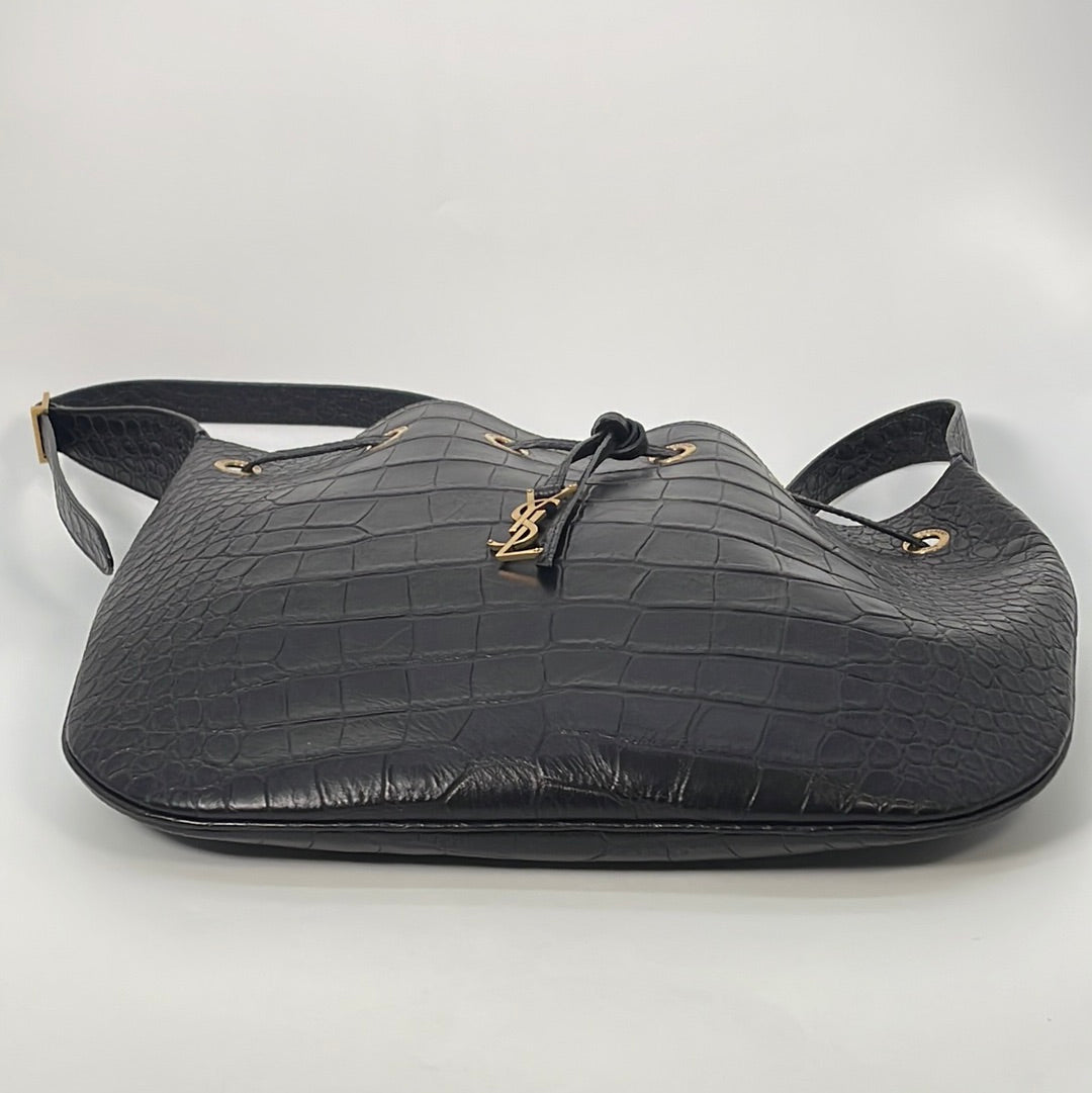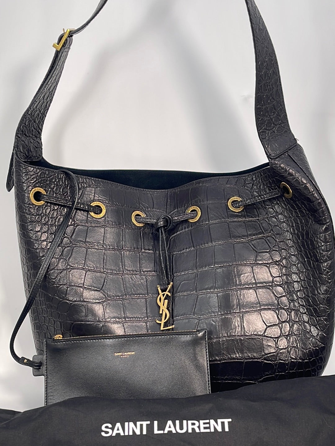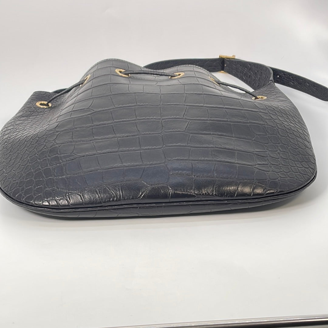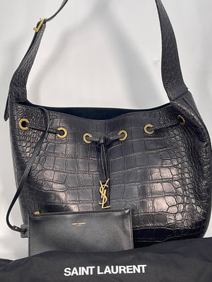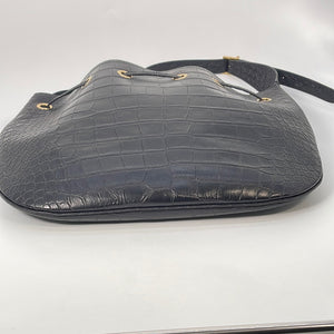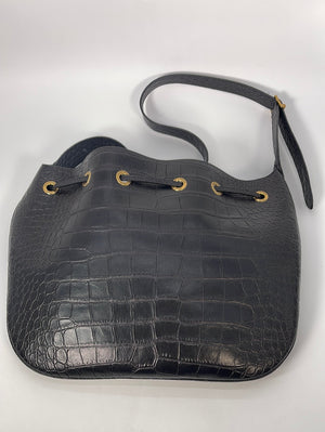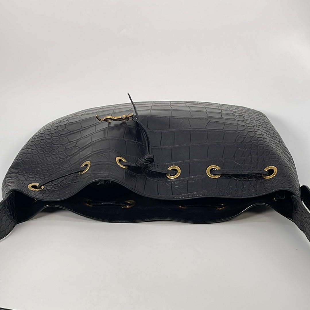 Preloved Saint Laurent Black Crocodile Seau Flat Hobo Shoulder Bag with Matching Pouch