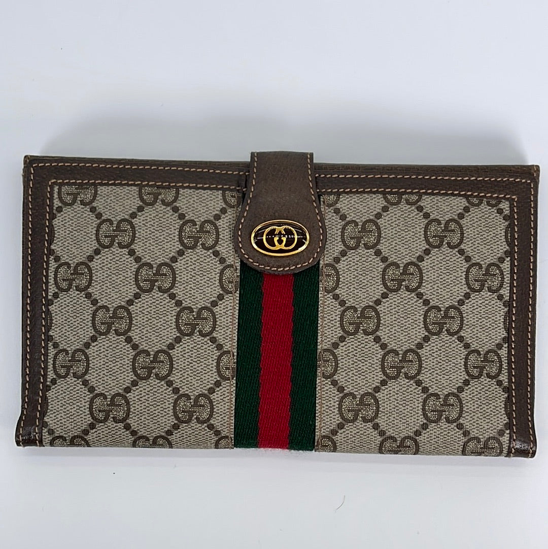 PRELOVED Vintage GUCCI Supreme Trifold Wallet. This wallet has a dedicated ID slot, nine card slots, a checkbook holder, and exterior pocket.
