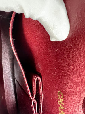 Features: diamond quilted soft lambskin leather, gold chain shoulder straps with a gold Chanel CC Mademoiselle turn lock on the facing flap. This opens to a burgundy leather interior. The convertible strap that can be worn as a shoulder strap, single strap or doubled