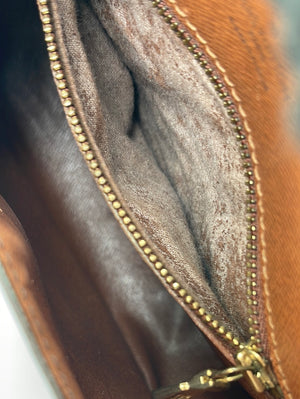 Preloved: Good vintage condition. Exterior canvas is clean. Some wear on outer pocket. Leather has aged to a honey patina. Interior is clean. Heavy wear in pocket. See photos!