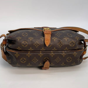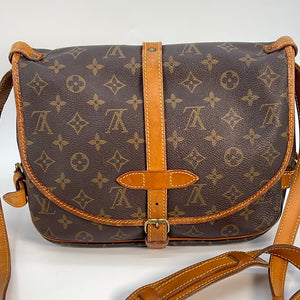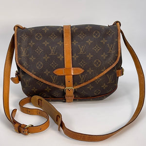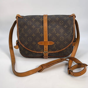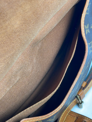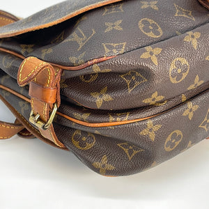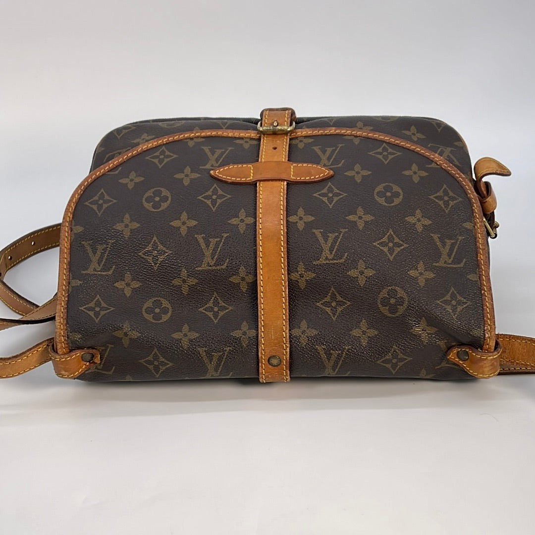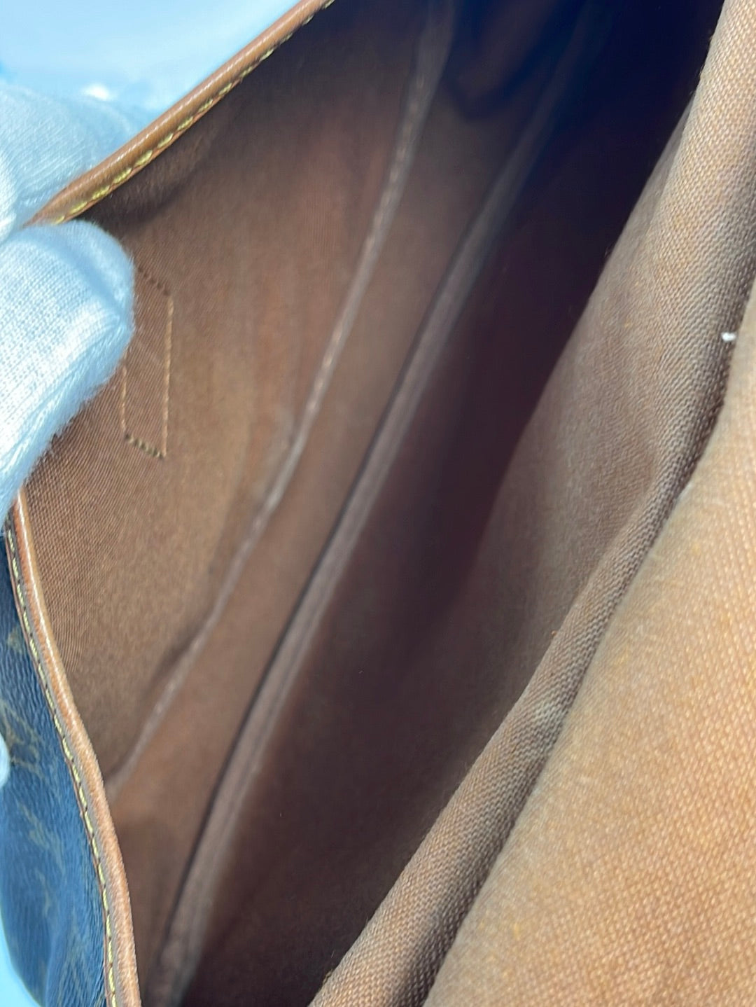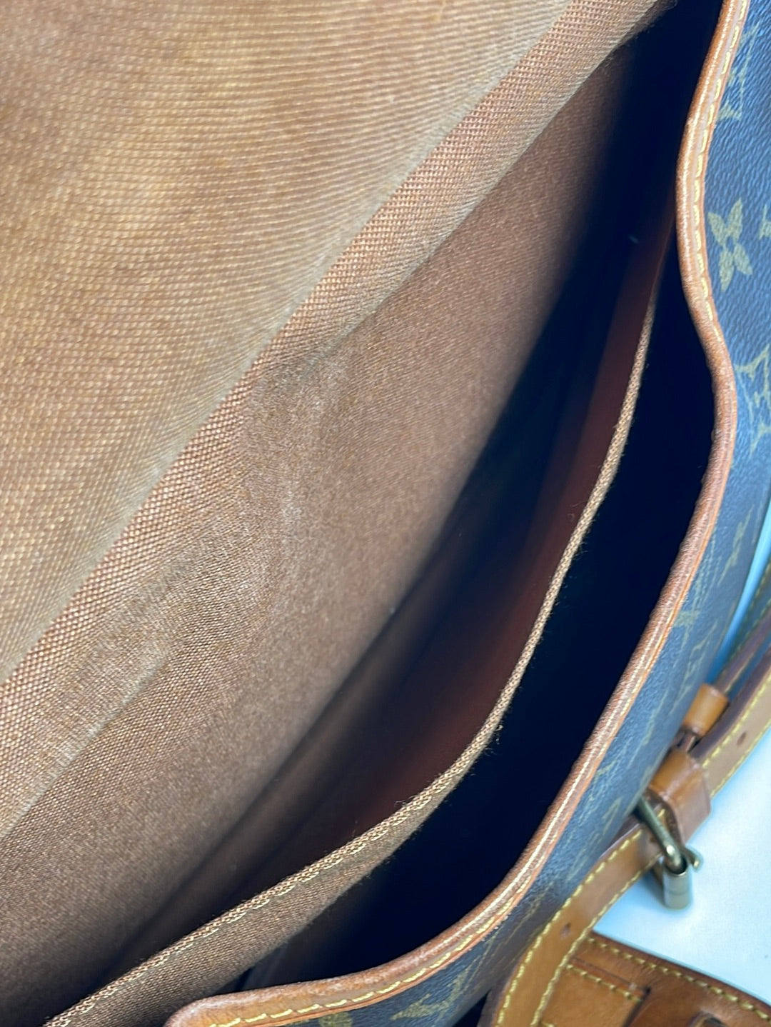 Authentic Vintage Louis Vuitton Monogram Canvas Saumur 30 Messenger Bag. Double compartment each with a buckle closure and adjustable long shoulder / crossbody strap.