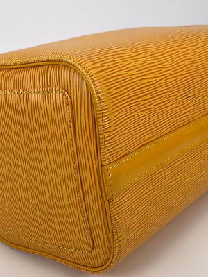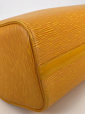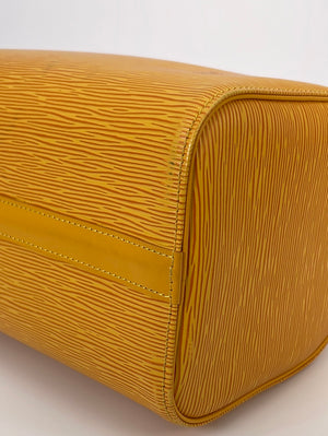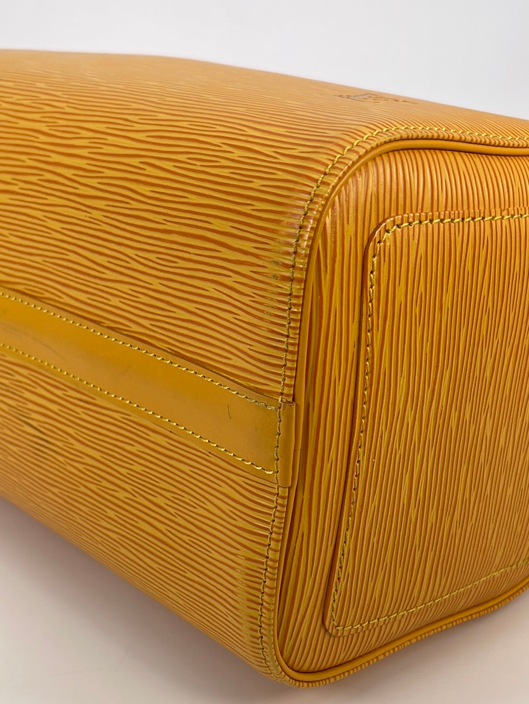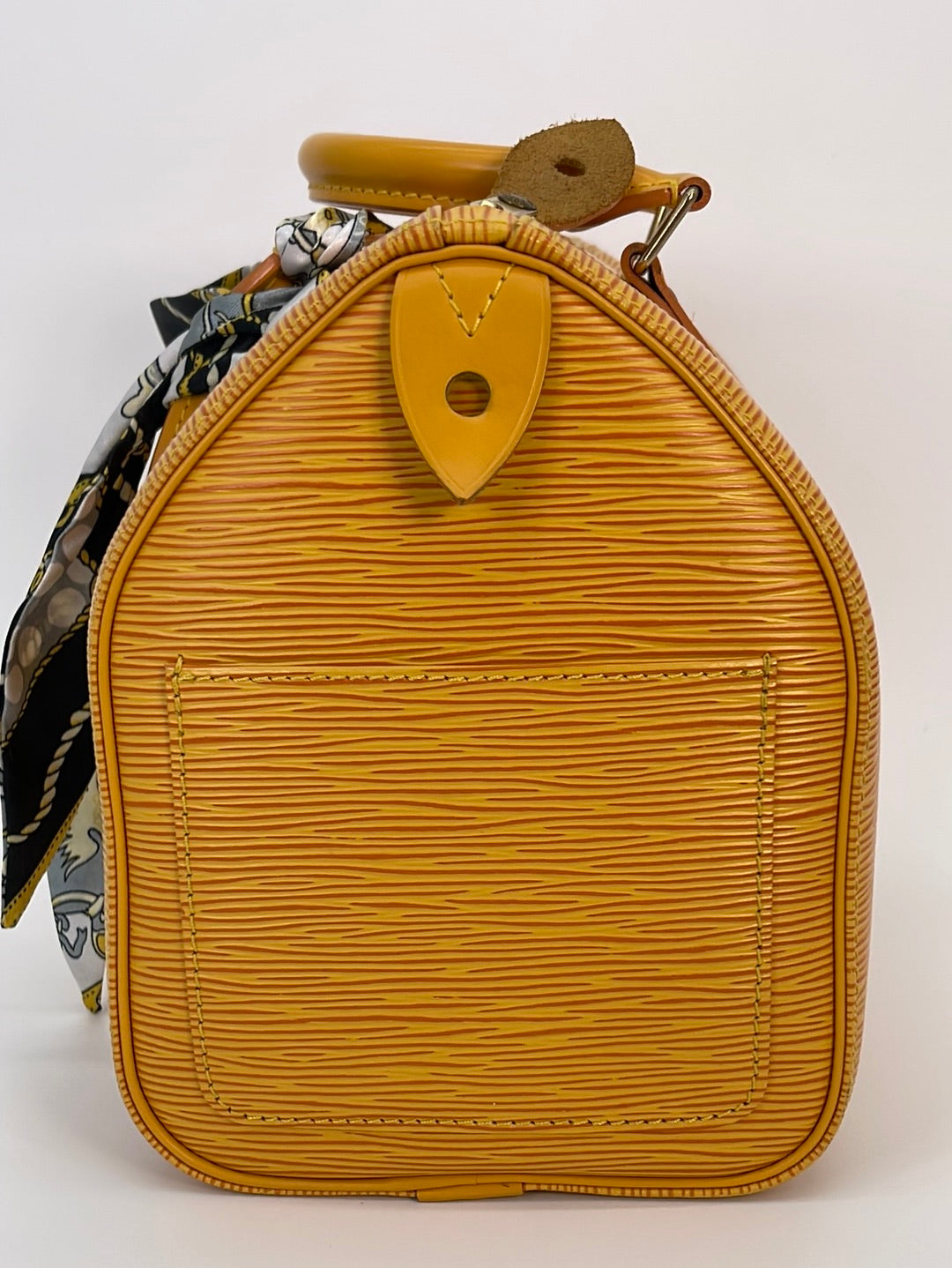 Vintage Louis Vuitton Speedy 25 Yellow Epi Leather Bag with Purple interior.