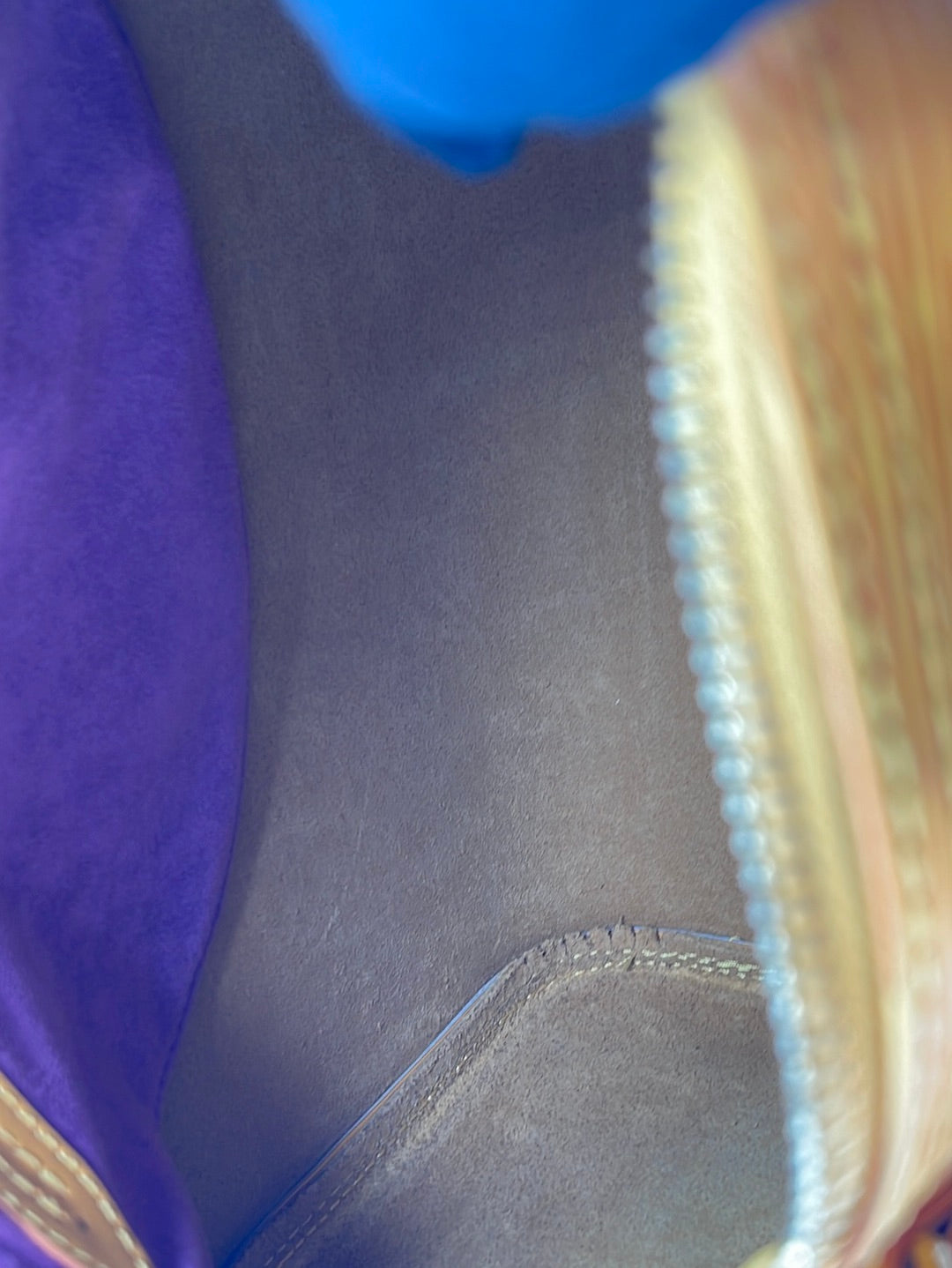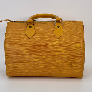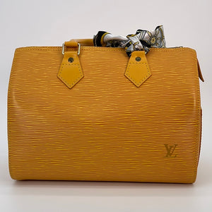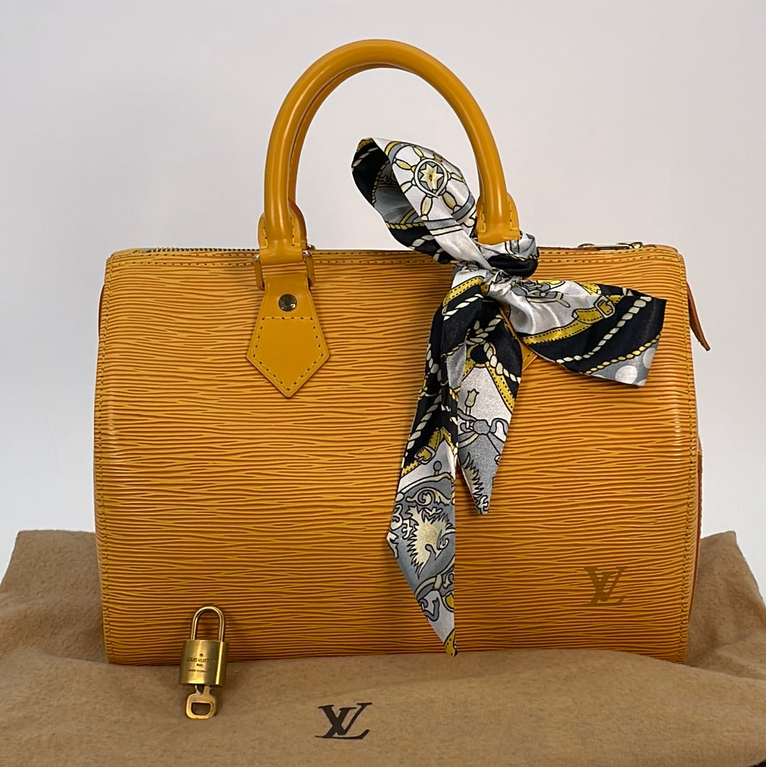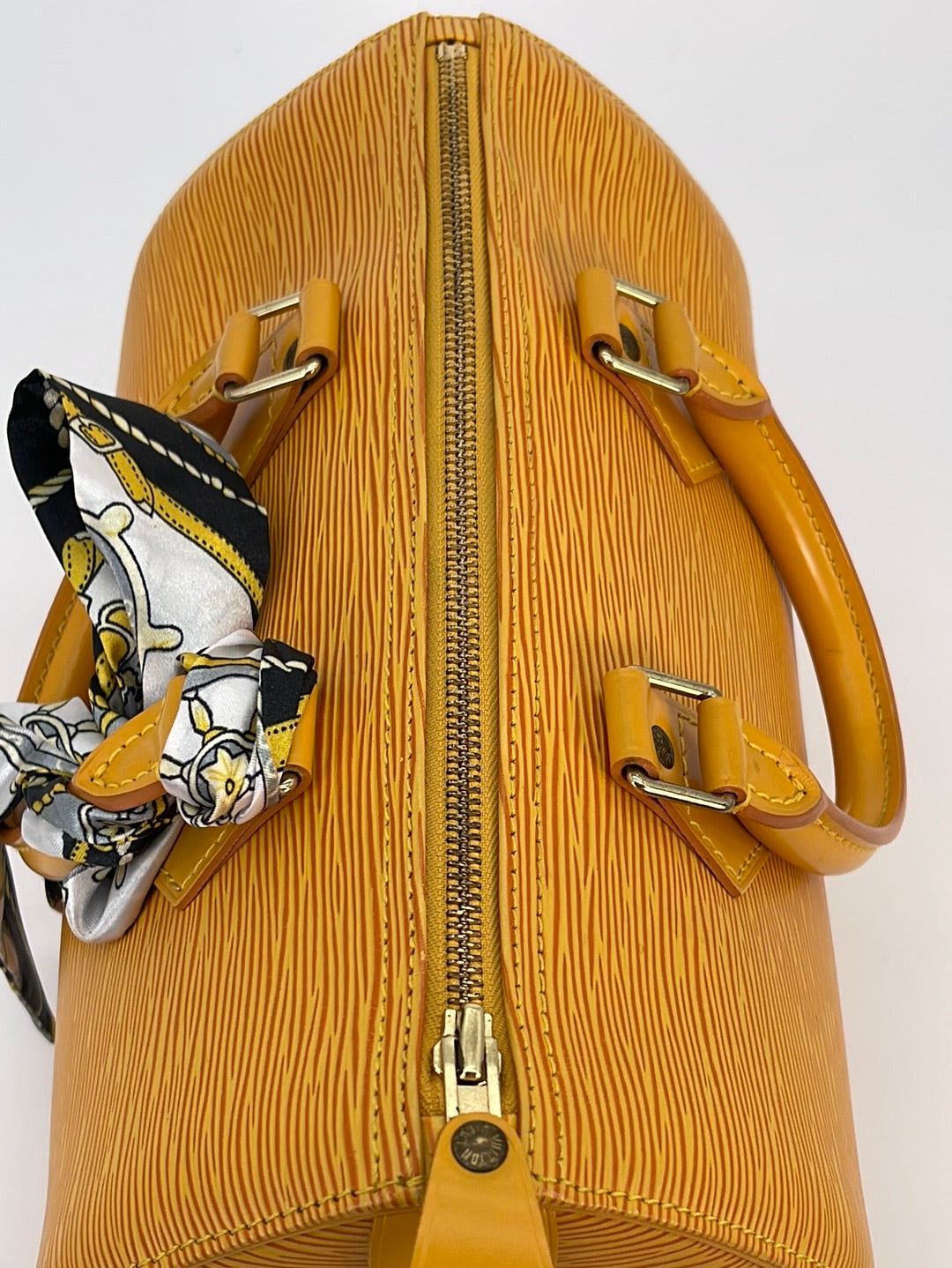 Vintage Louis Vuitton Speedy 25 Yellow Epi Leather Bag with Purple interior.