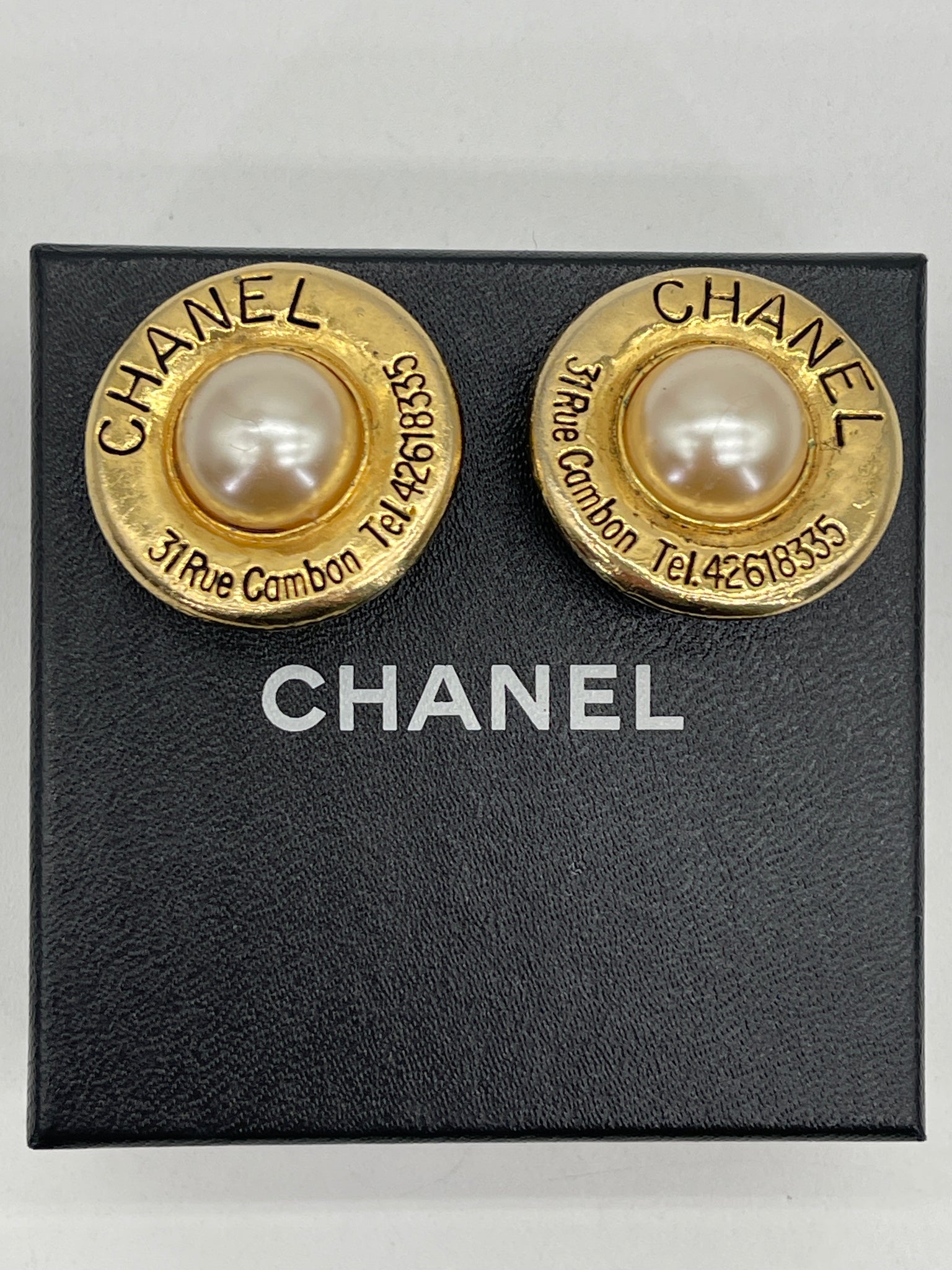 Preloved CHANEL Gold Tone 31 Rue Cambon Tel 42618335 Faux Pearl Clip-on Earring.