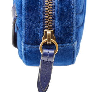 Preloved Gucci Blue GG Marmont Matelasse Velvet Belt Bag. This belt bag features a velvet body with a gold-tone hardware, an adjustable flat waist strap, a top zip closure, and an interior slip pocket.