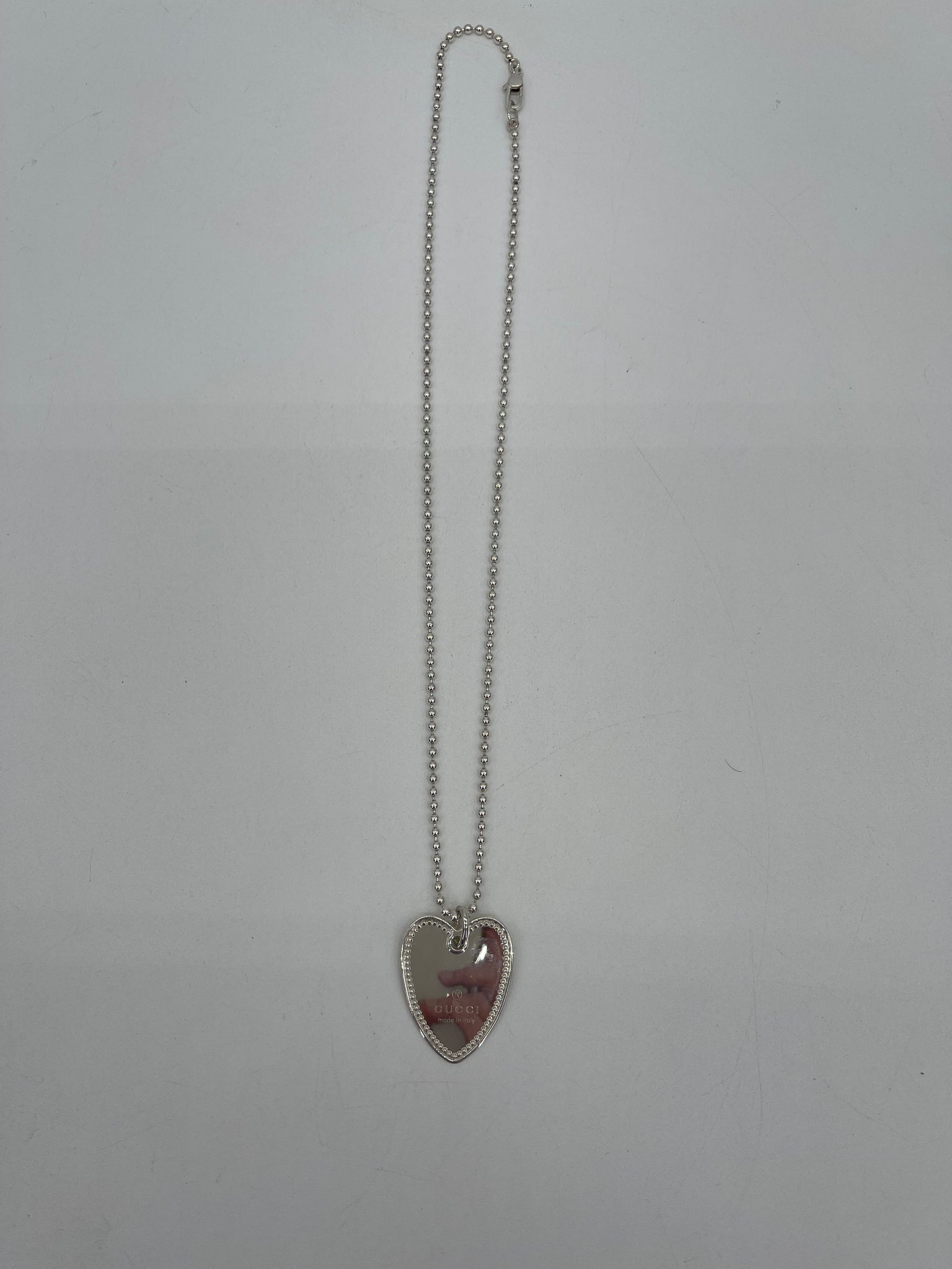 Preloved Gucci Silver Heart Pendant Necklace. Introducing the Gucci brand necklace, this 925 silver model is designed for both women and men. This item remains a symbol of style and quality, perfect for complementing any outfit with understated, subtle elegance.