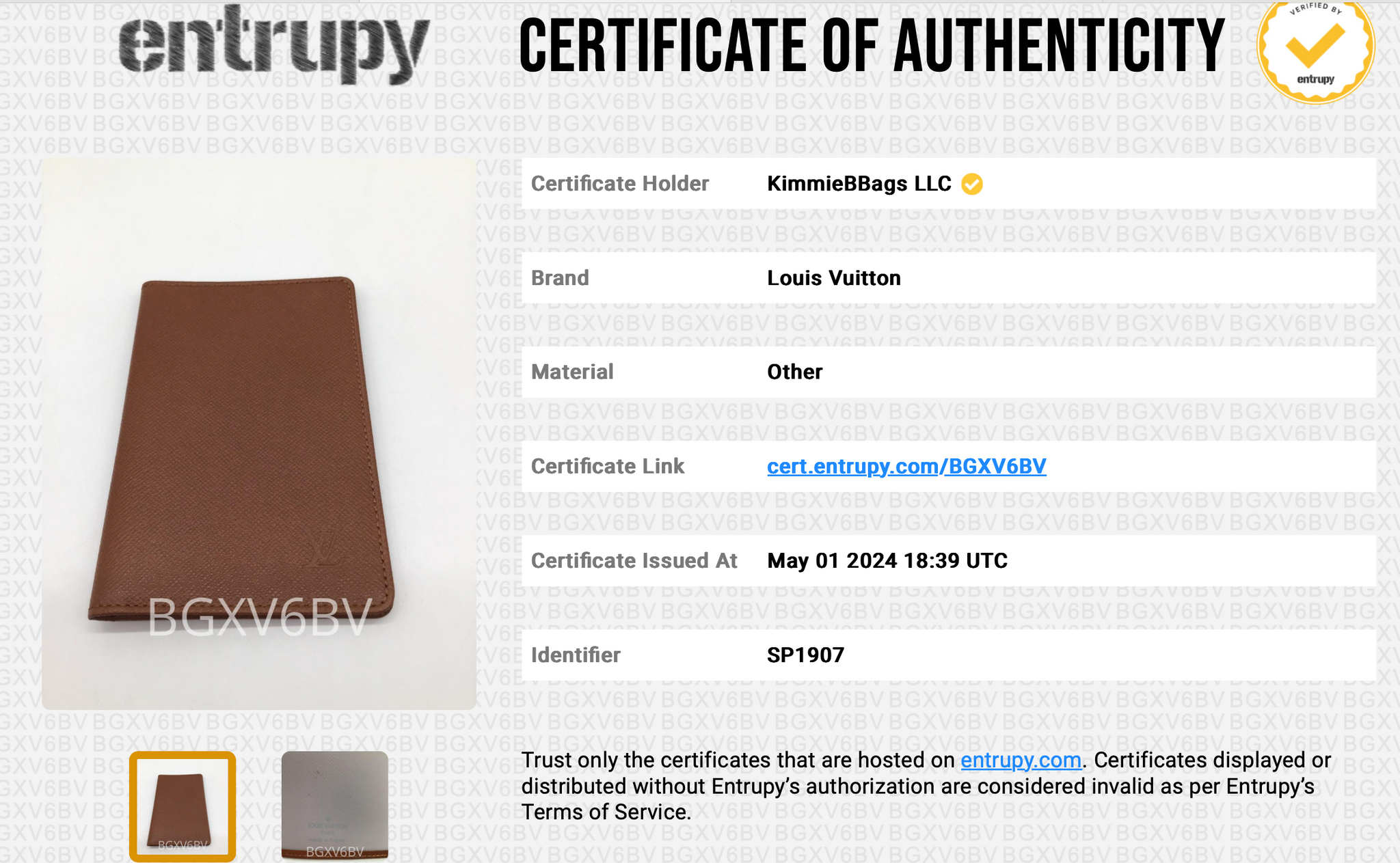 Entrupy letter of Authenticity!