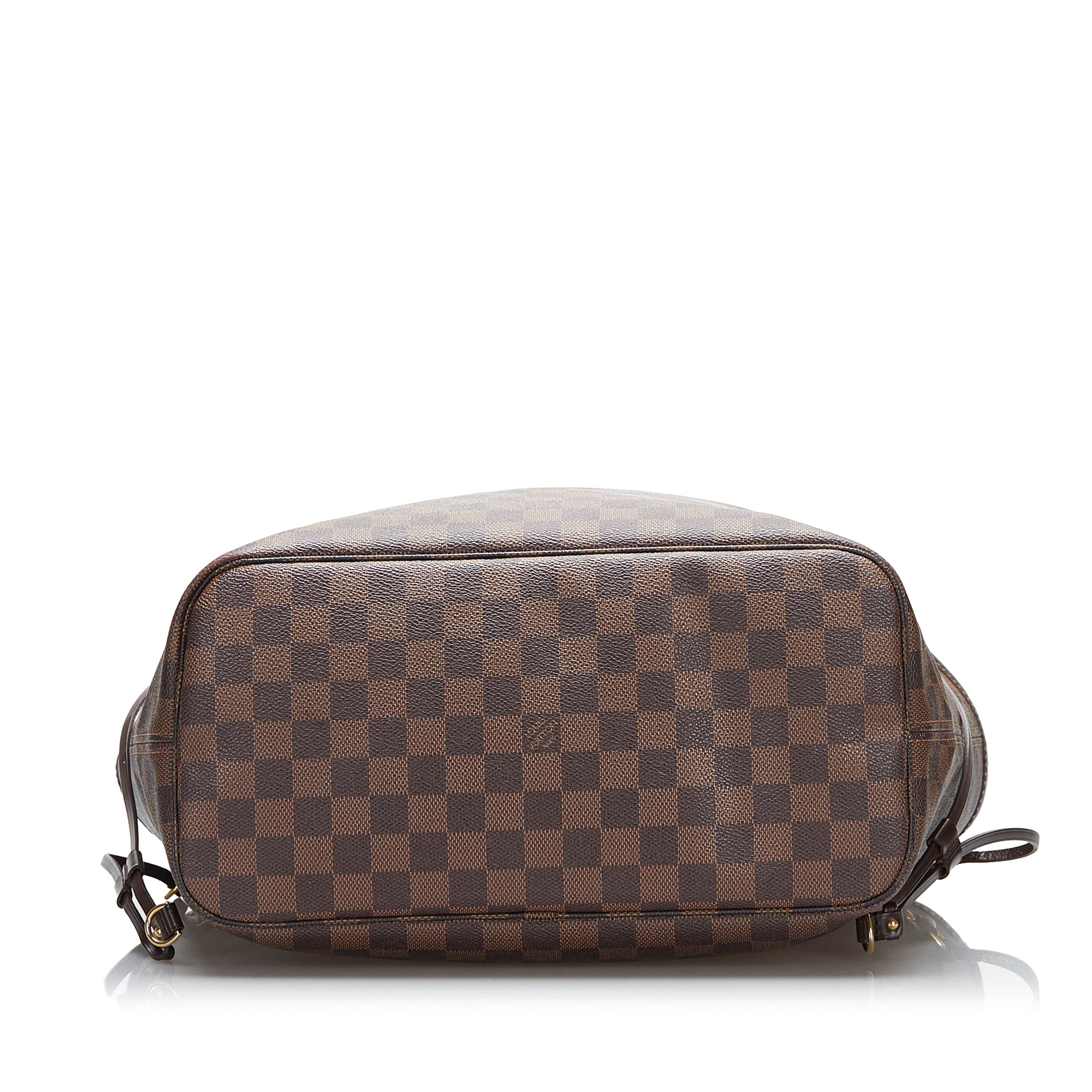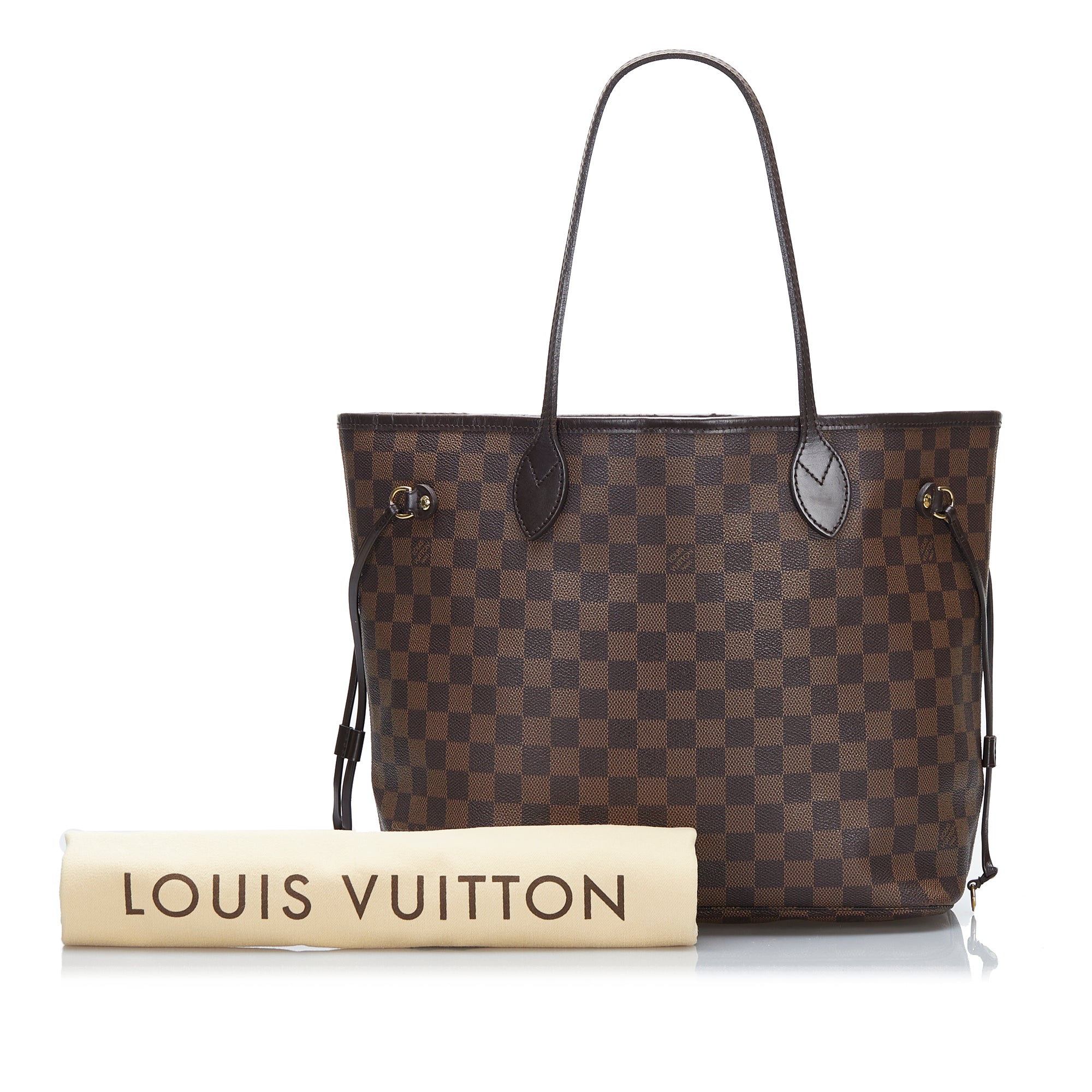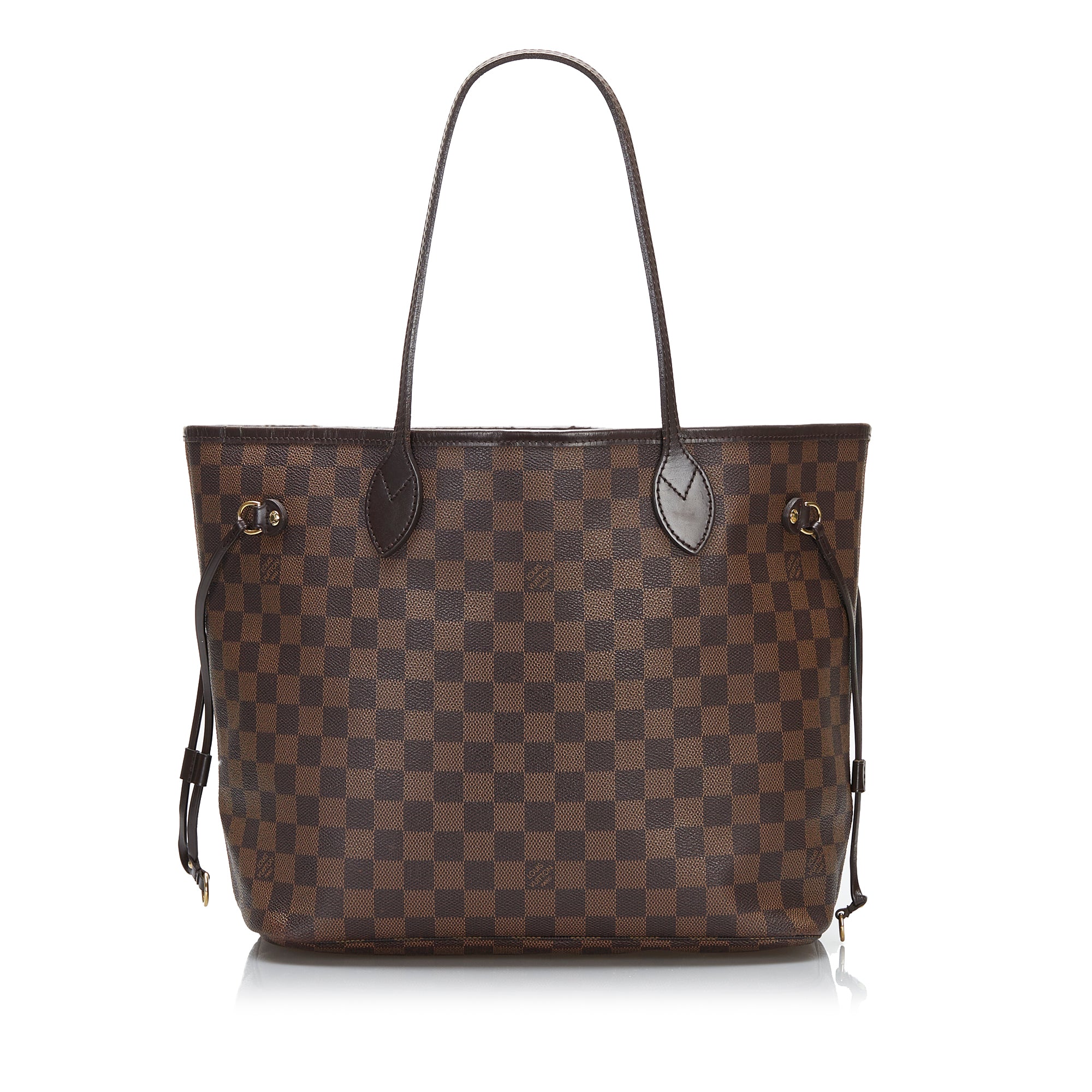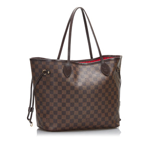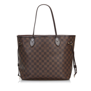 The Neverfull MM features a damier canvas body, flat leather handles, an open top with lobster claw clasp closure, and an interior zip pocket.