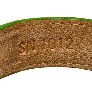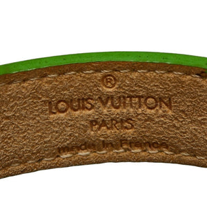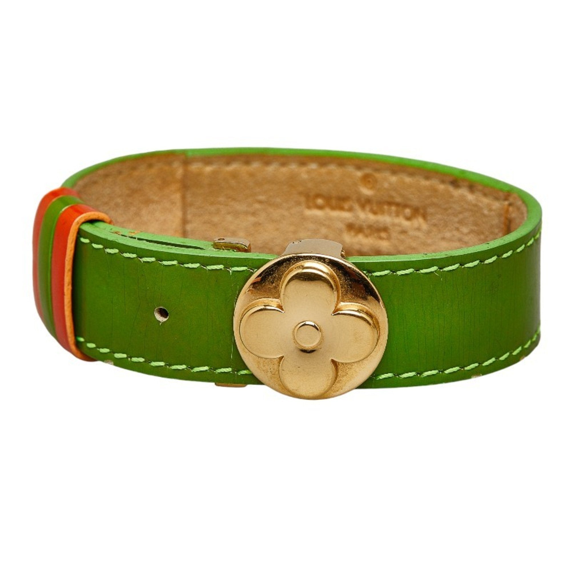 PRELOVED Louis Vuitton Green Wish Leather Wrap Bracelet is made out of leather and has a monogram flower clasp in gold hardware.