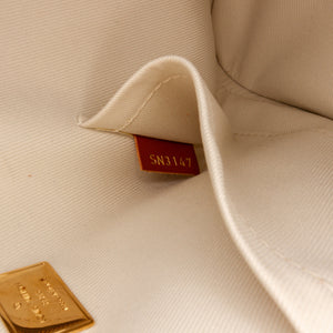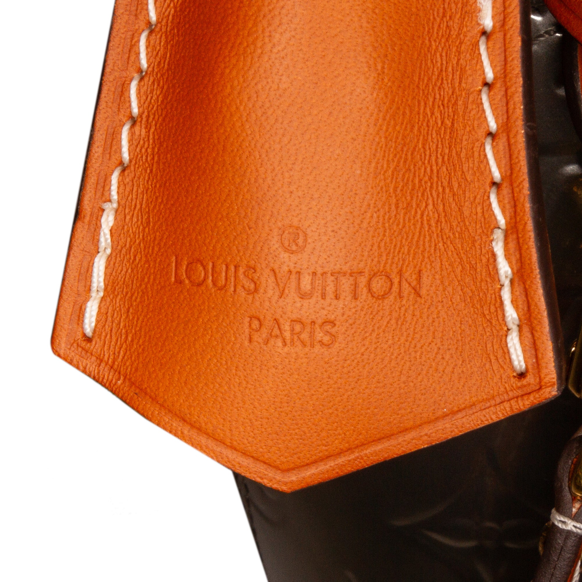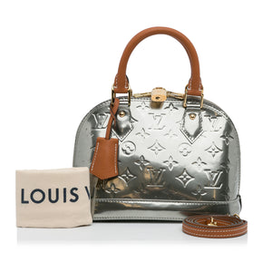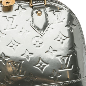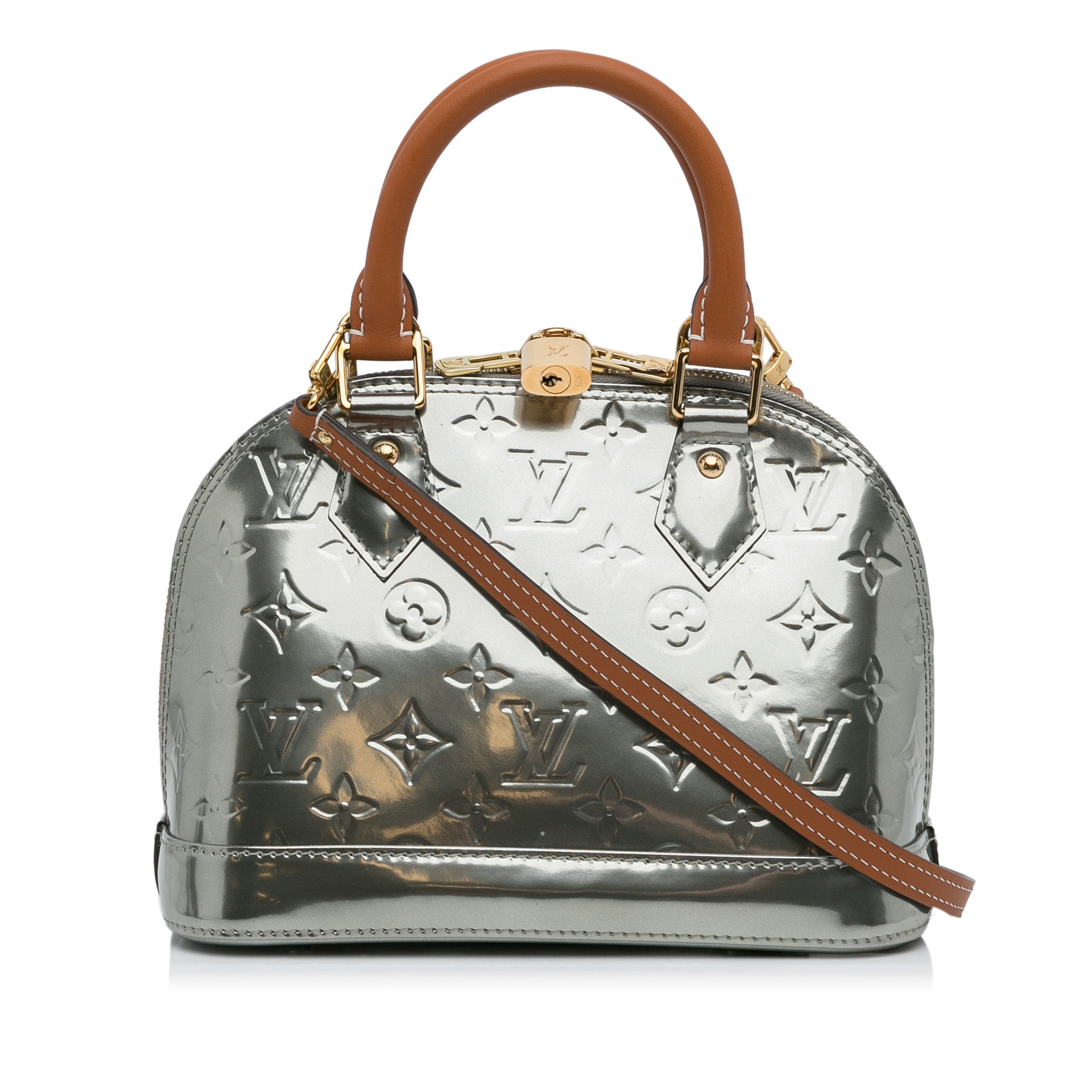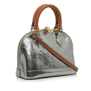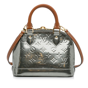 The Alma BB features a vernis leather body, rolled leather handles, a detachable flat leather strap, a top zip around closure, a clochette, and an interior slip pocket.