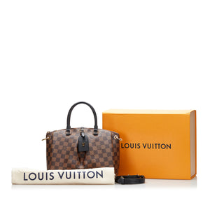 The Odeon Tote PM features a damier ebene body, rolled leather handles, a detachable strap, a top zip closure, and interior slip pockets.