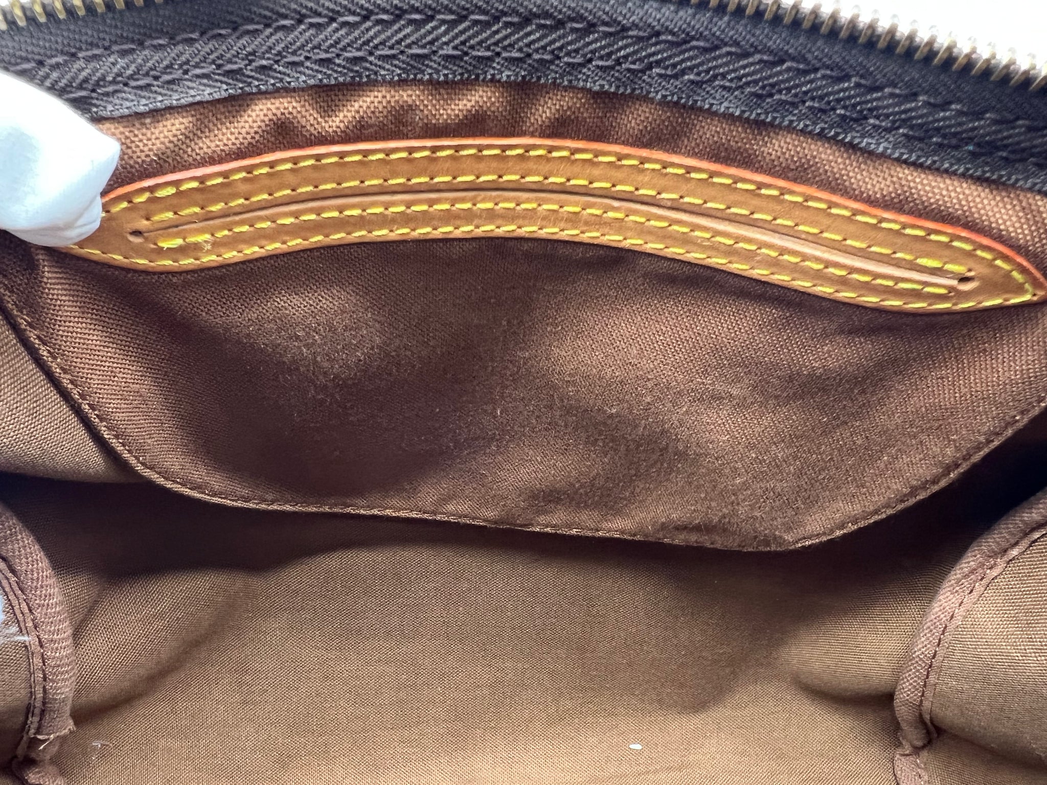 PRELOVED: Great USED CONDITION: Exterior canvas is clean. Leather is a medium patina. Interior is clean. Interior pocket is clean! See photos!