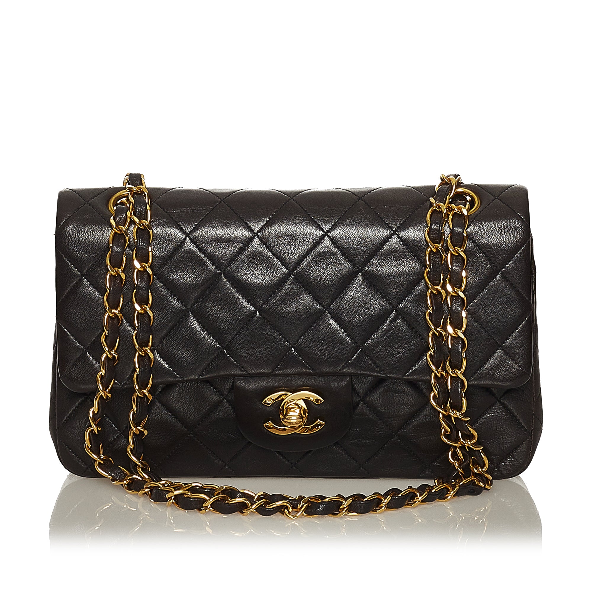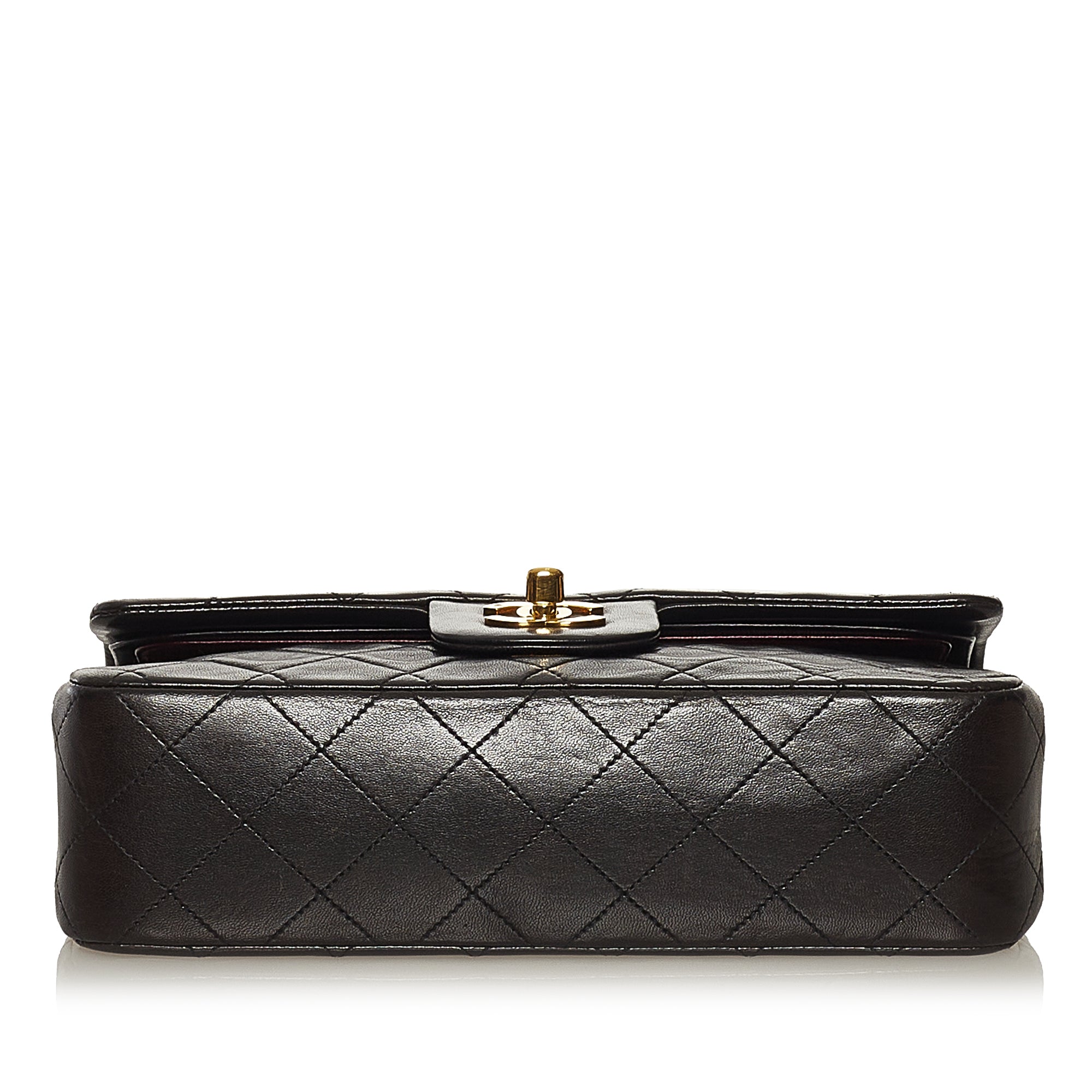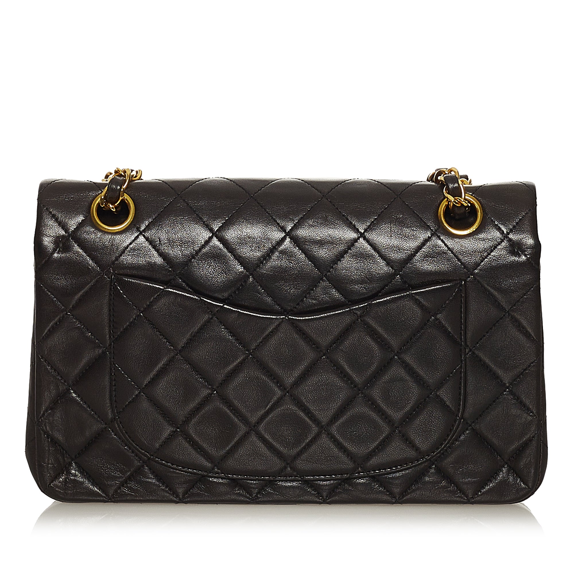 This shoulder bag features a quilted lambskin body, an exterior back slip pocket, leather woven chain straps, double front flaps with interlocking Cs and a twist lock closure, and interior slip pockets.