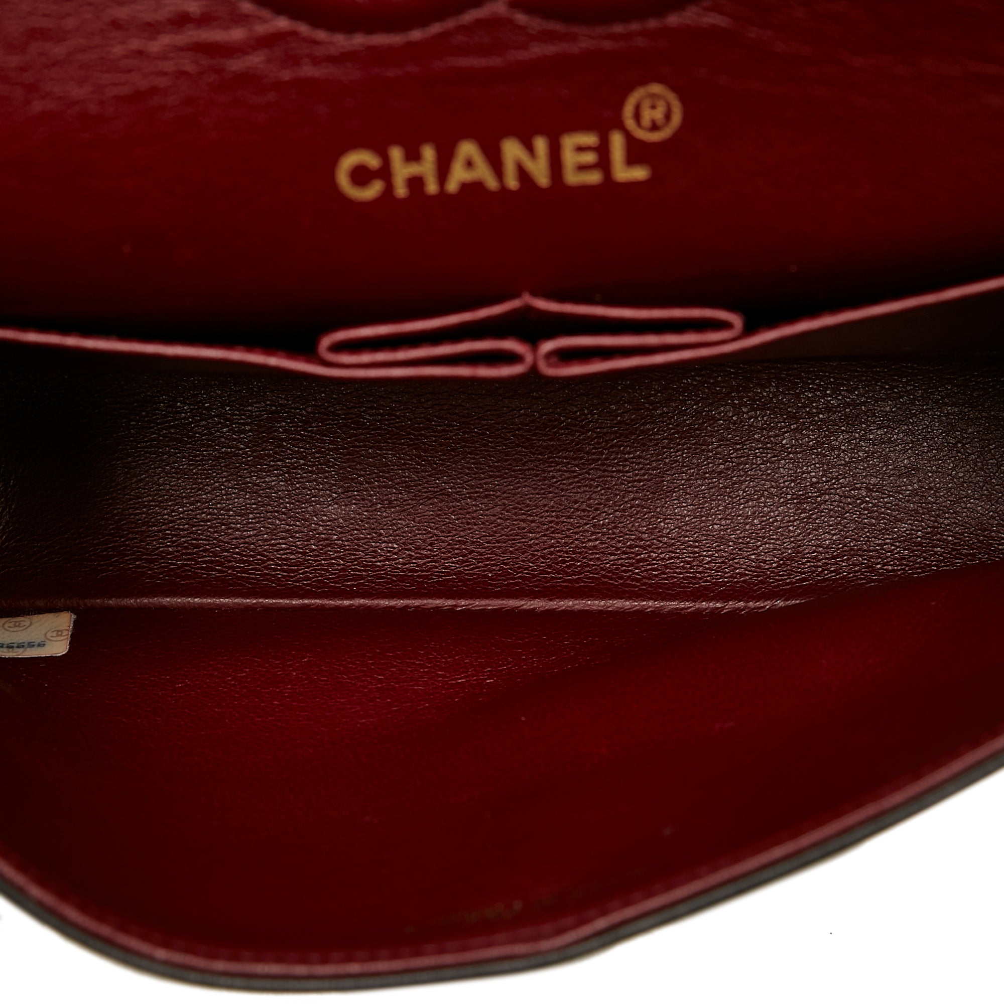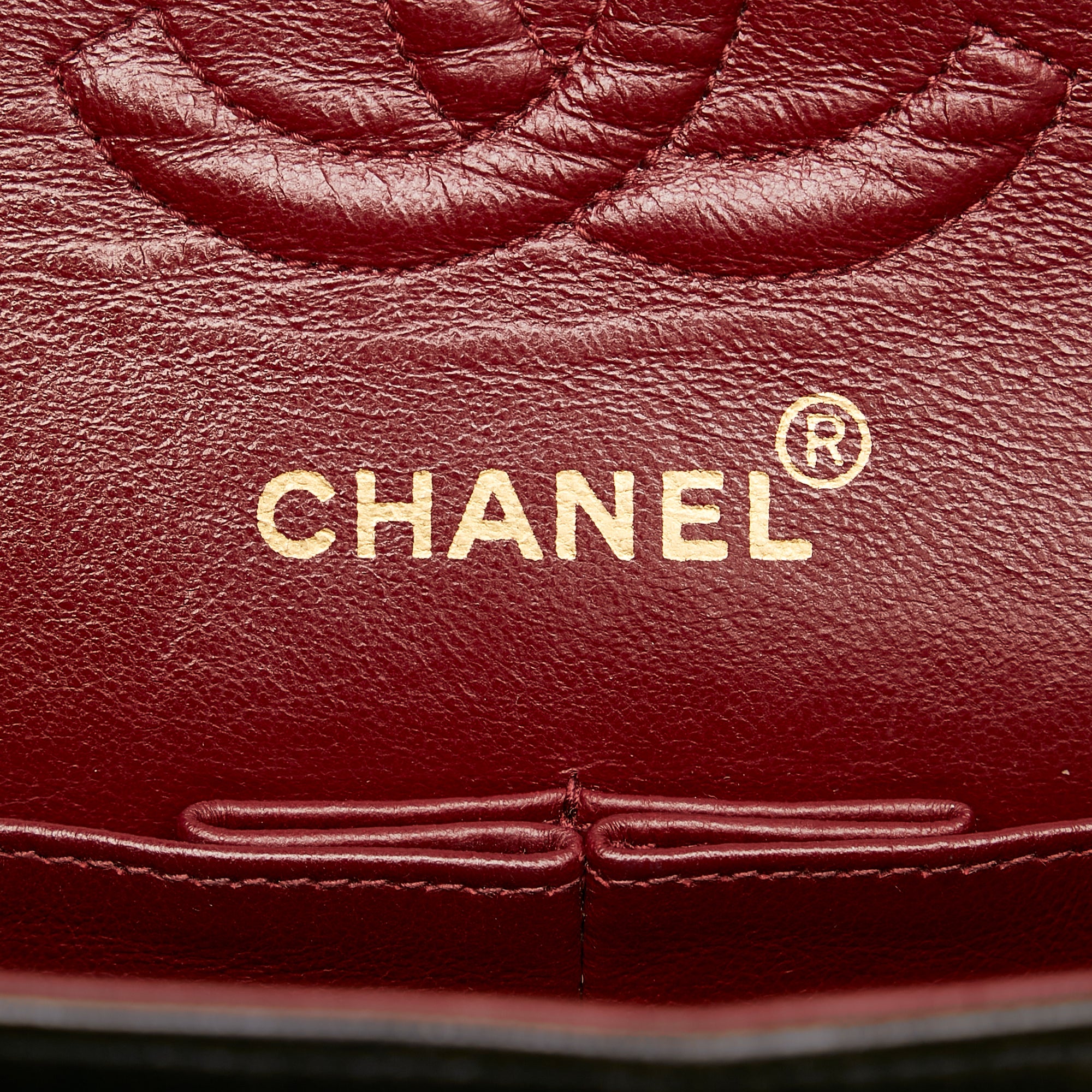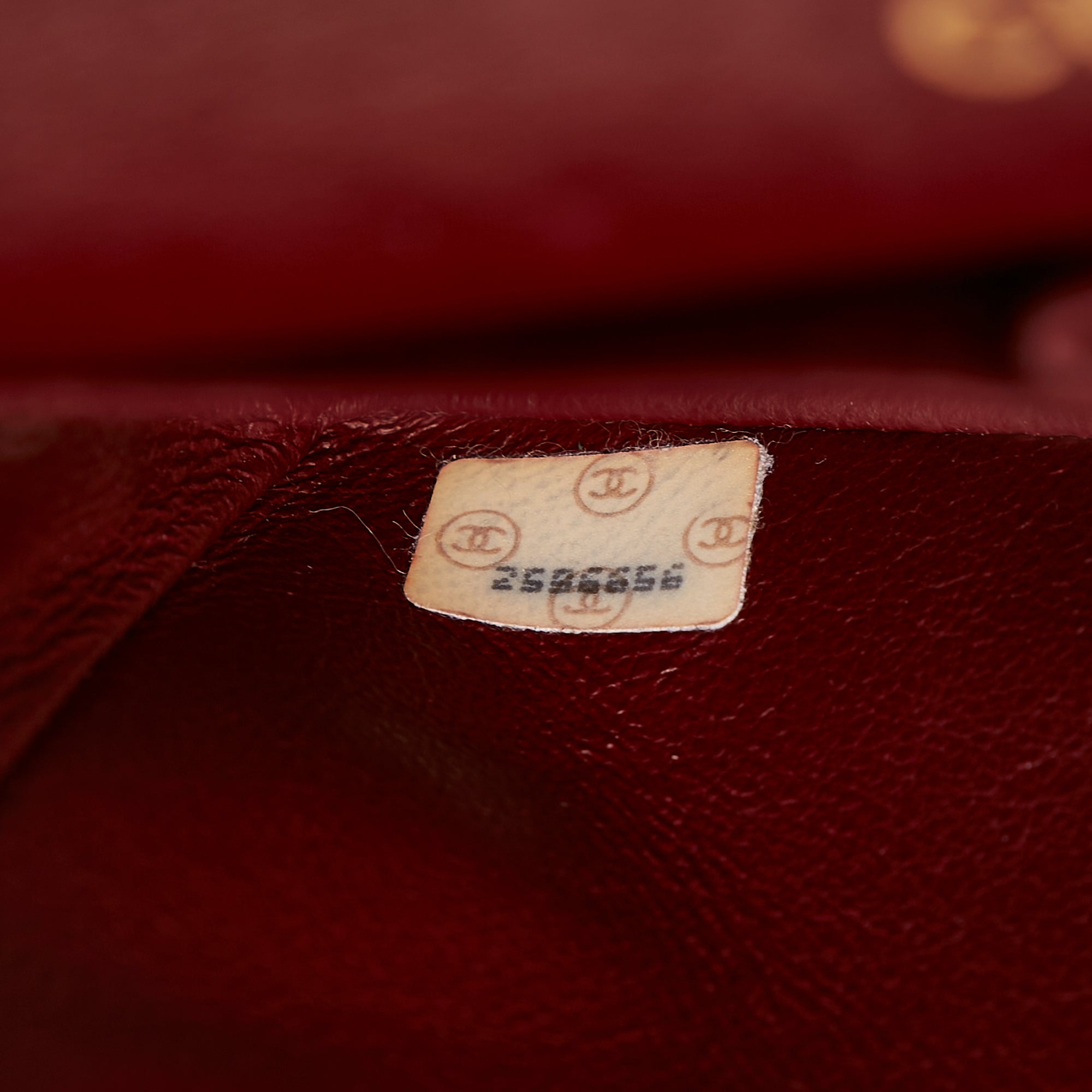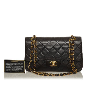 This shoulder bag features a quilted lambskin body, an exterior back slip pocket, leather woven chain straps, double front flaps with interlocking Cs and a twist lock closure, and interior slip pockets.