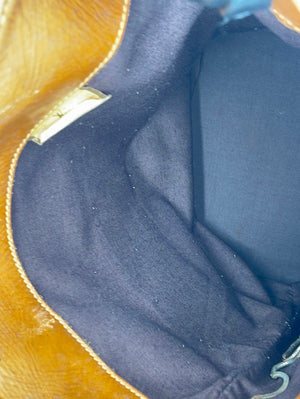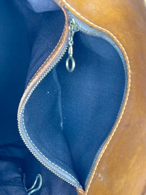 PRELOVED: Good vintage condition. Exterior canvas is in good condition. Leather trim has some wear and rubbing. Base leather trim has rubbing. Clasp for the interior chain is missing. Storage odor. Initial "R" embossed on interior leather trim. See photos!