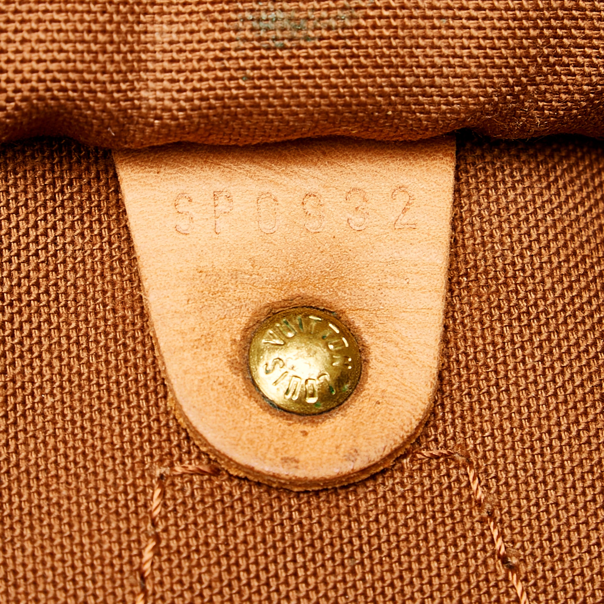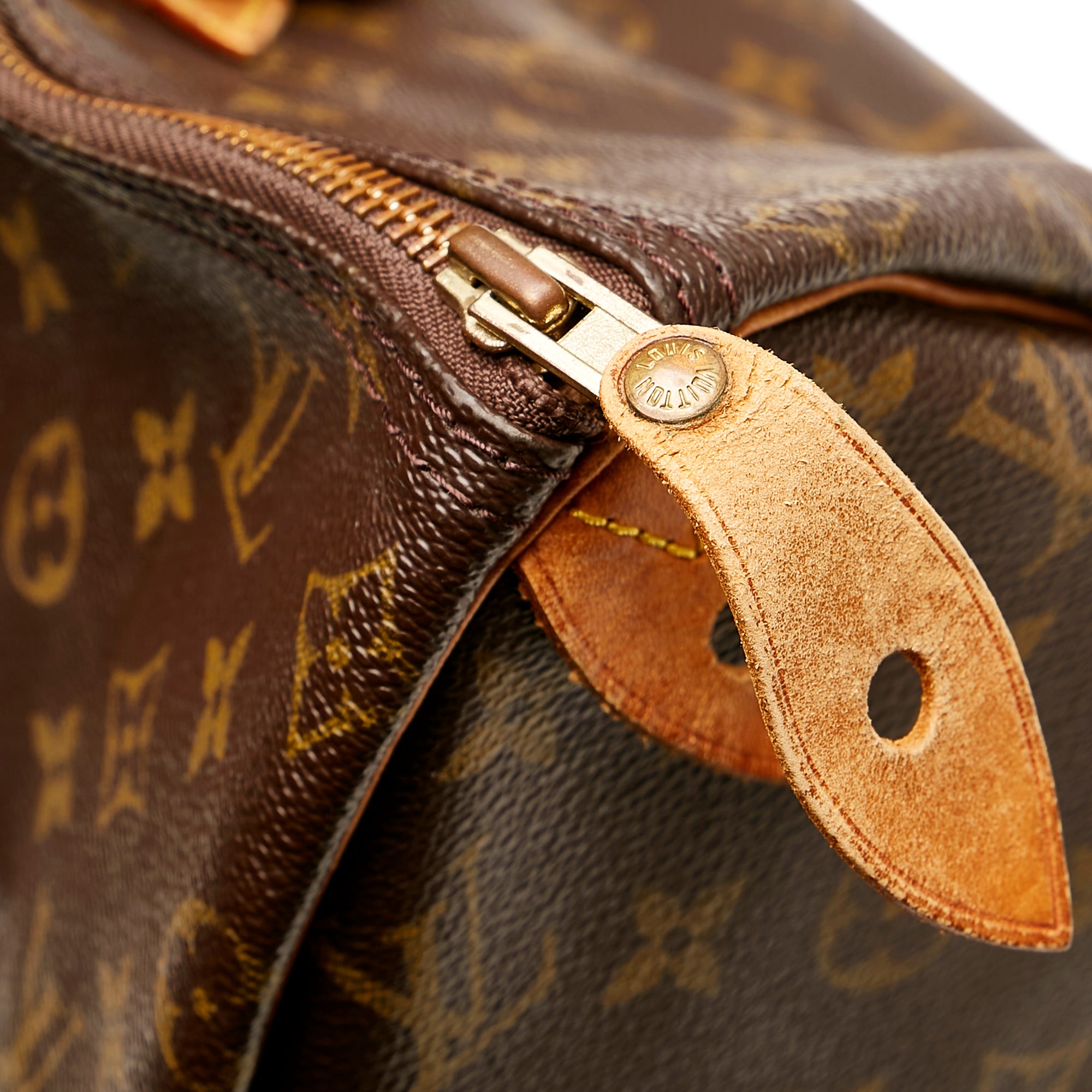 The Speedy 40 features a monogram canvas body, rolled leather handles, a top zip closure, and an interior slip pocket.